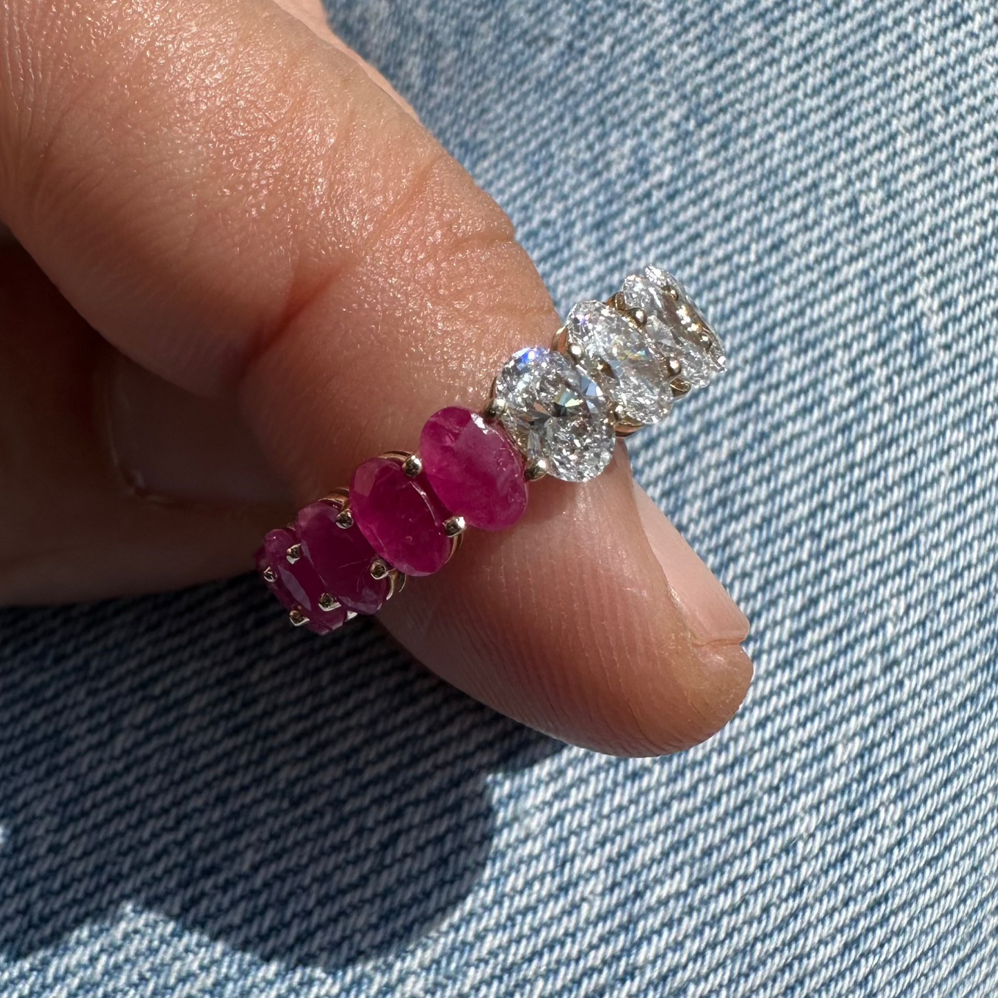 Elevate your style with the ARABELLA Lab Grown Diamond and Ruby Eternity Band. Made with 14k gold and featuring one side of oval brilliant cut lab grown diamonds and one side of genuine rubies, this ring showcases the perfect balance of elegance and uniqueness. Enhance any look with this stunning piece.
