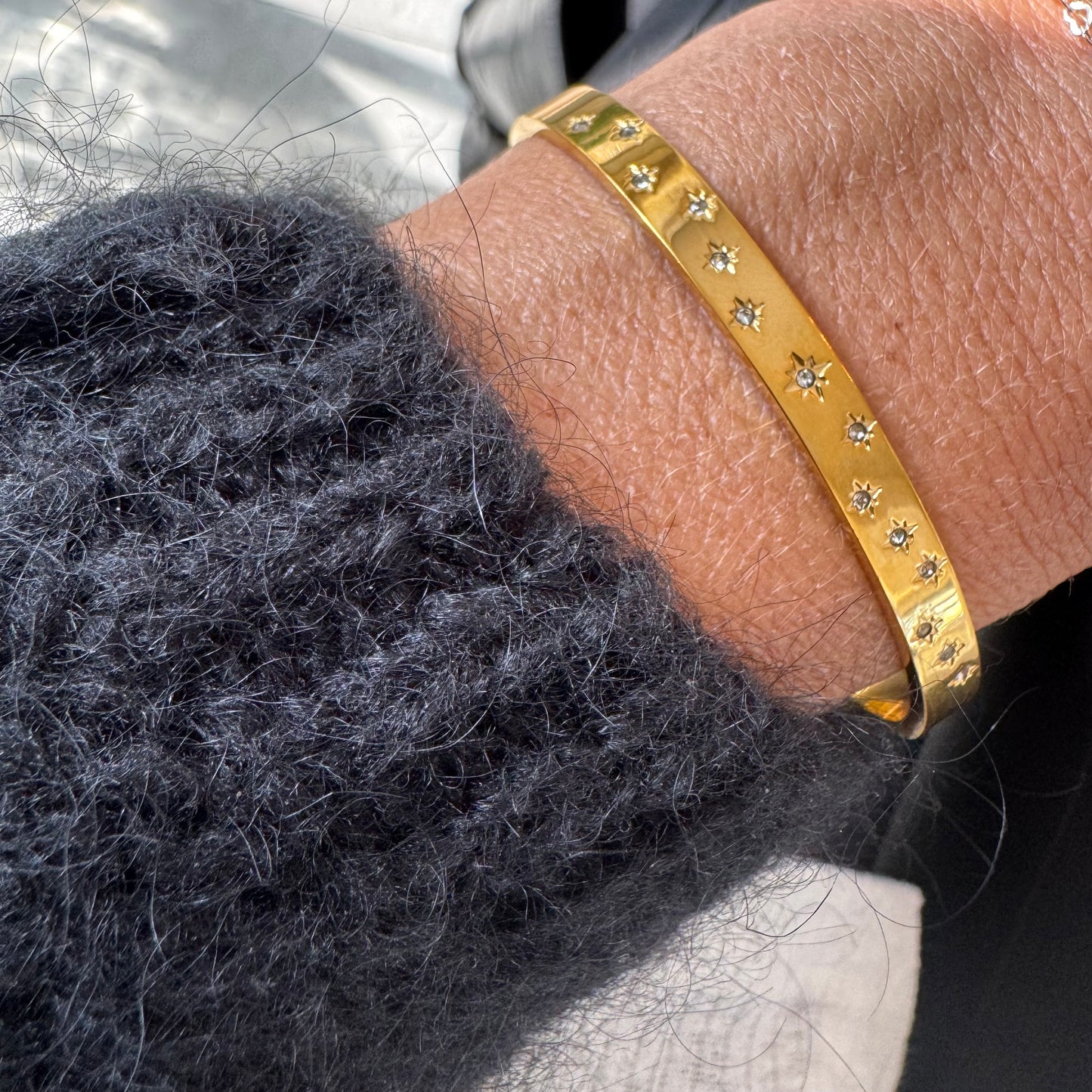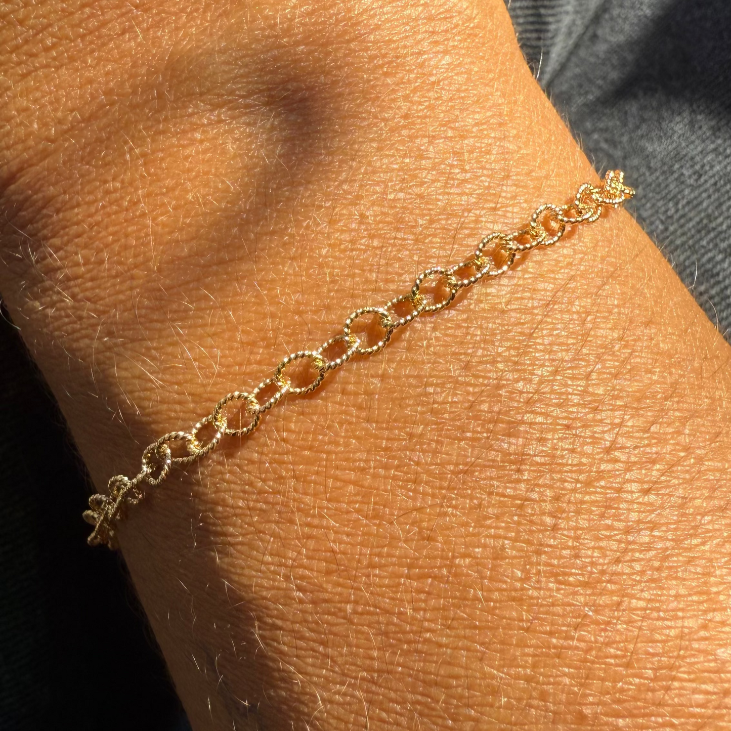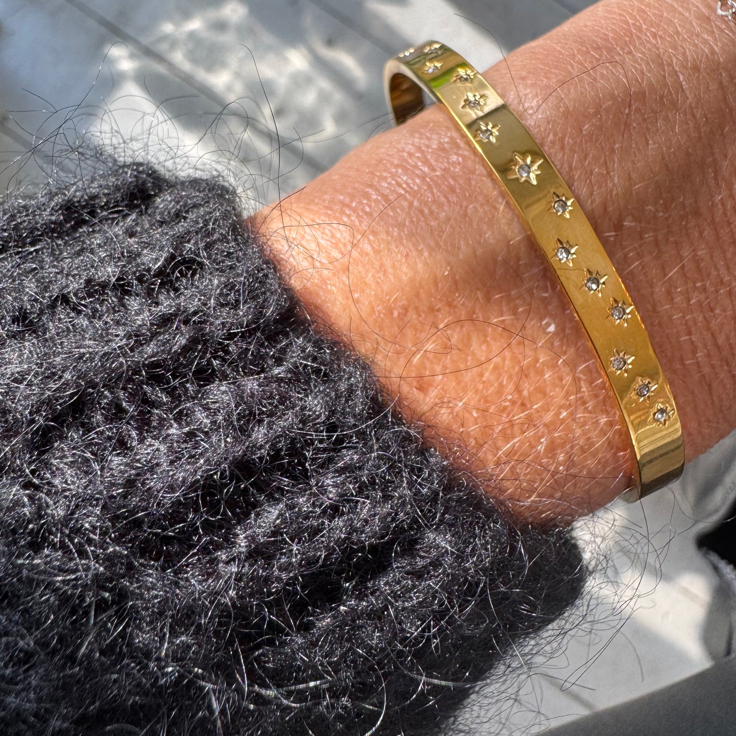 Close-up of a person's wrist wearing a gold bracelet with sunlight casting shadows.
