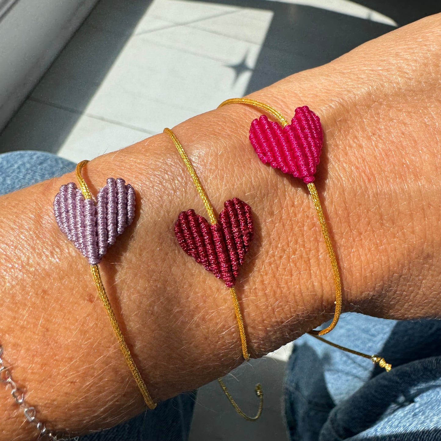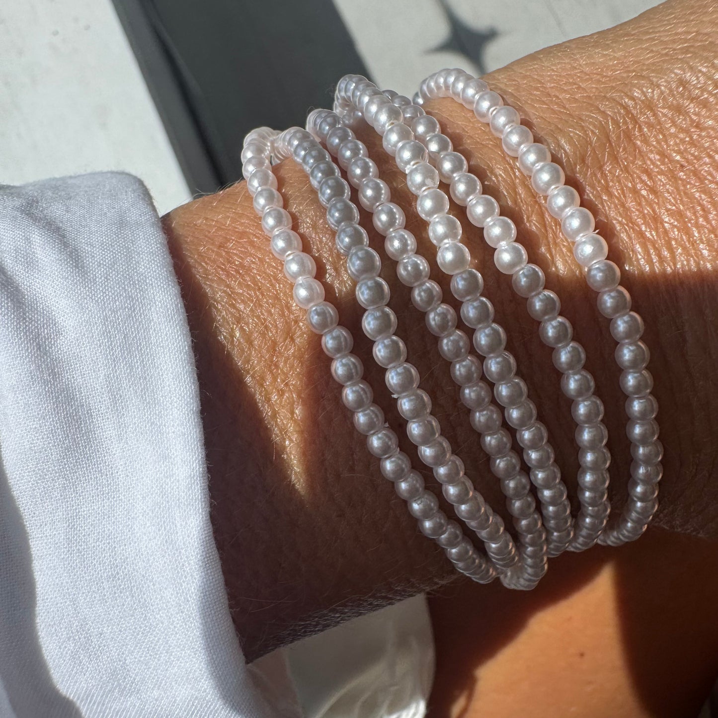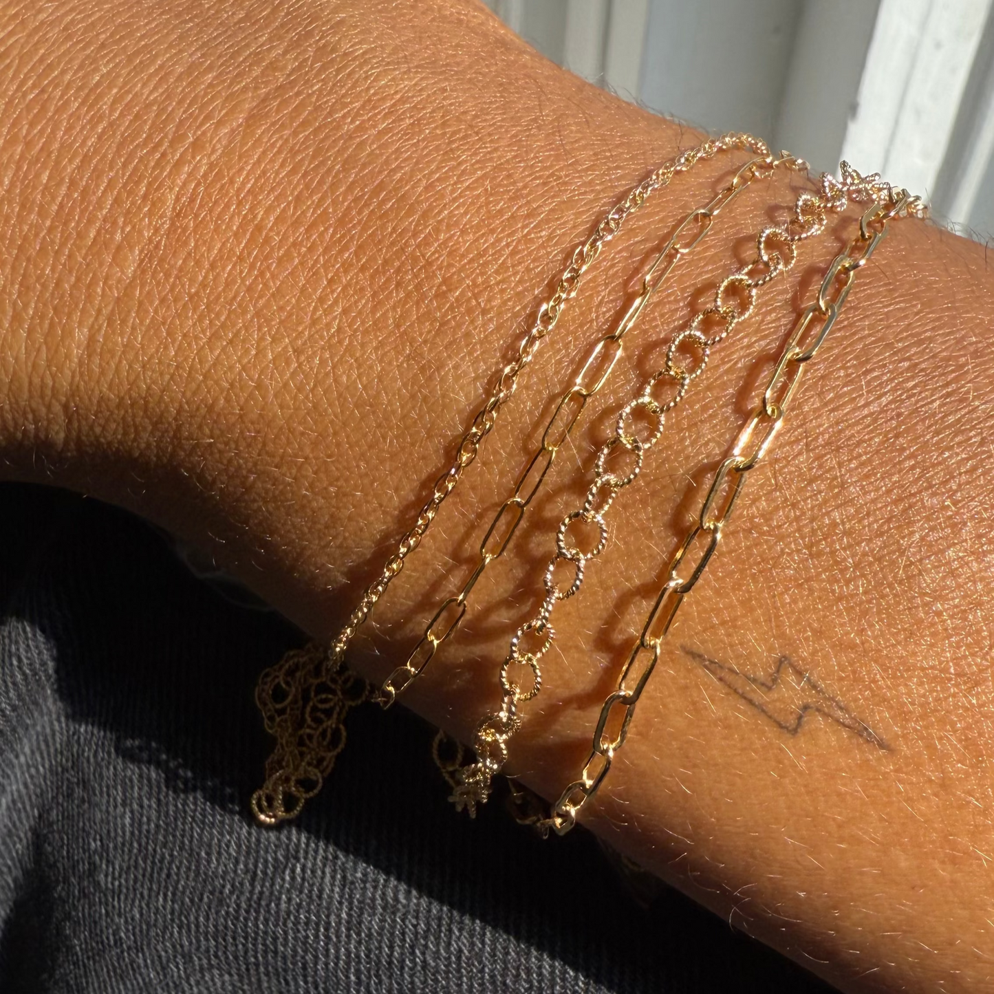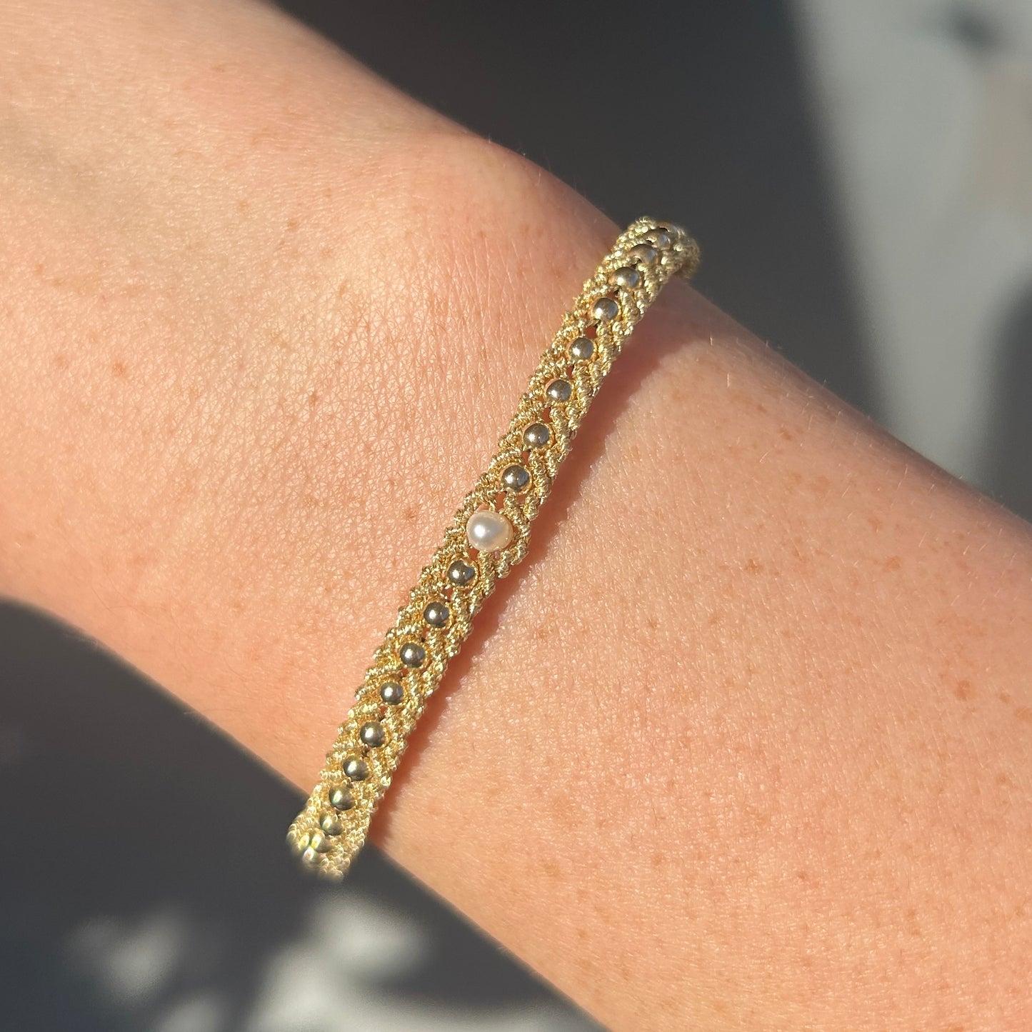 Close-up of a person's wrist wearing a gold bracelet with sunlight casting shadows.