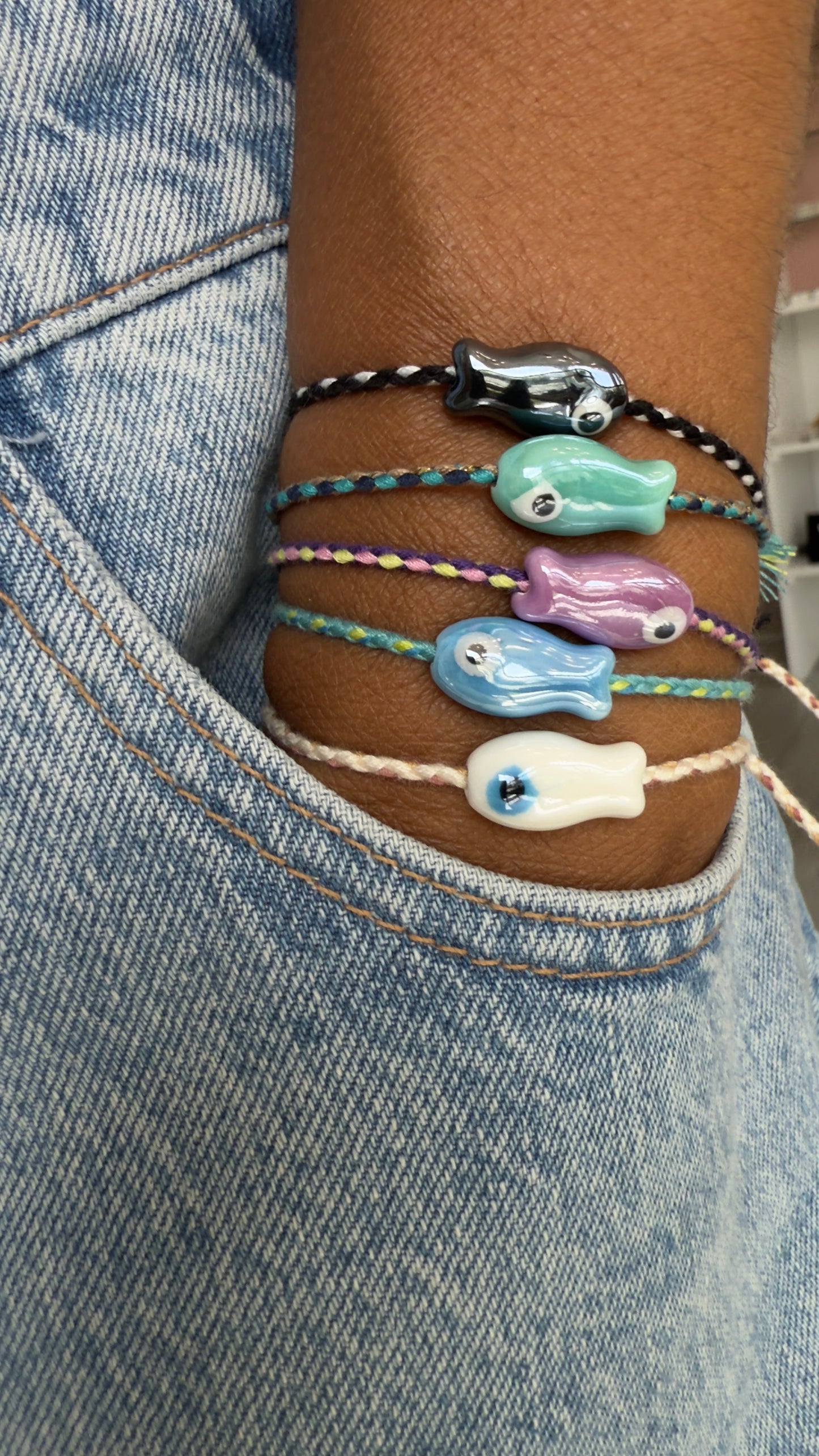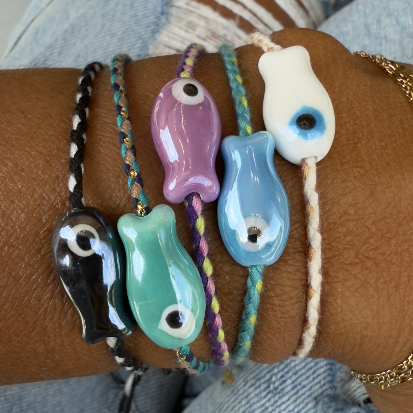 MINNOW BRAIDED BRACELETS are crafted with a glass fish-shaped charm and a stylish braided cord, these bracelets are perfect for the summer. Representing good luck and the calming spirit of the beach.
