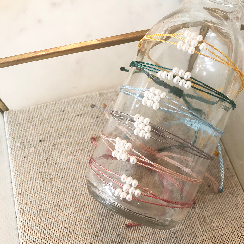 Wish Me Luck Pearl Bracelets are available in the following cord colors: rosé, dusty rose, gray, mustard, turquoise, emerald