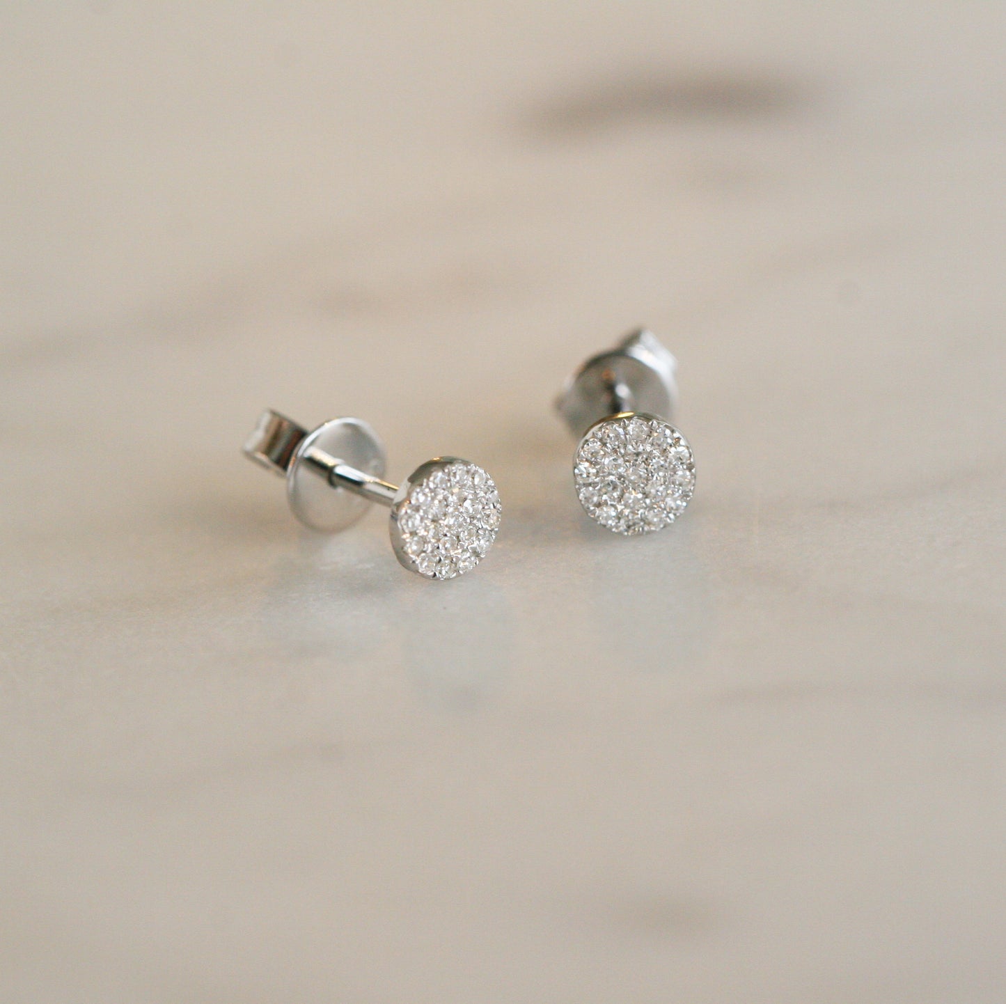 These diamond disc stud earrings are made of 14k gold and 38 sparkling diamonds totaling 0.09 cts.