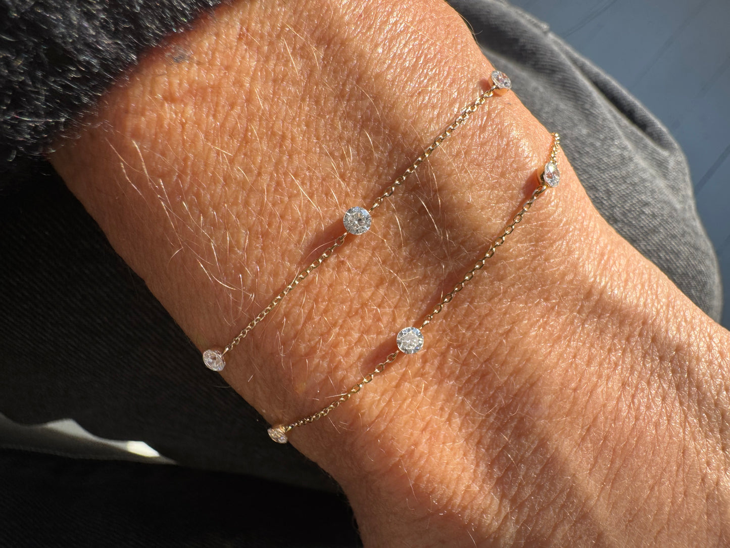 Adorn your wrist with the NIGHT SKY BRACELET. Made of solid 14k gold and adorned with 5 sparkling 3mm lab grown diamonds, this bracelet adds sparkle to any outfit. Delicate and stylish, it's the perfect addition to your jewelry collection. Sold as a a single strand.