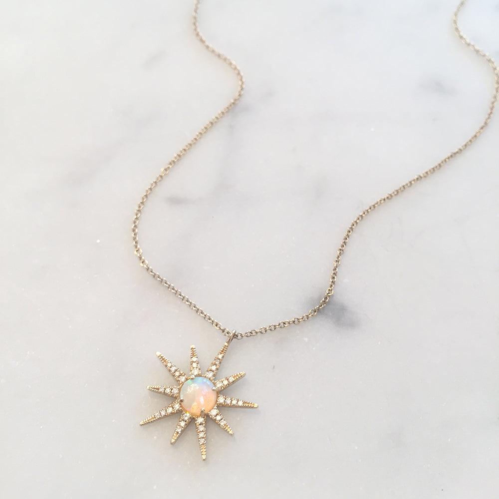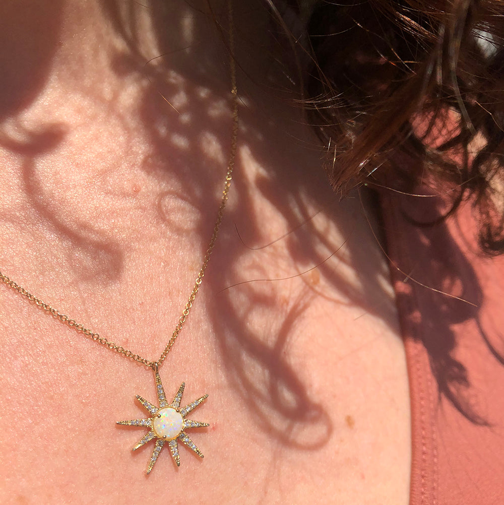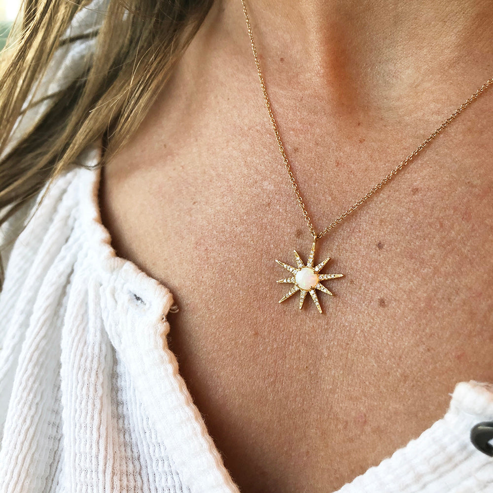Make a statement with this 14k yellow gold starburst necklace. It features a 0.34 opal center stone and 35 x 0.11 accent diamonds. Wow!
