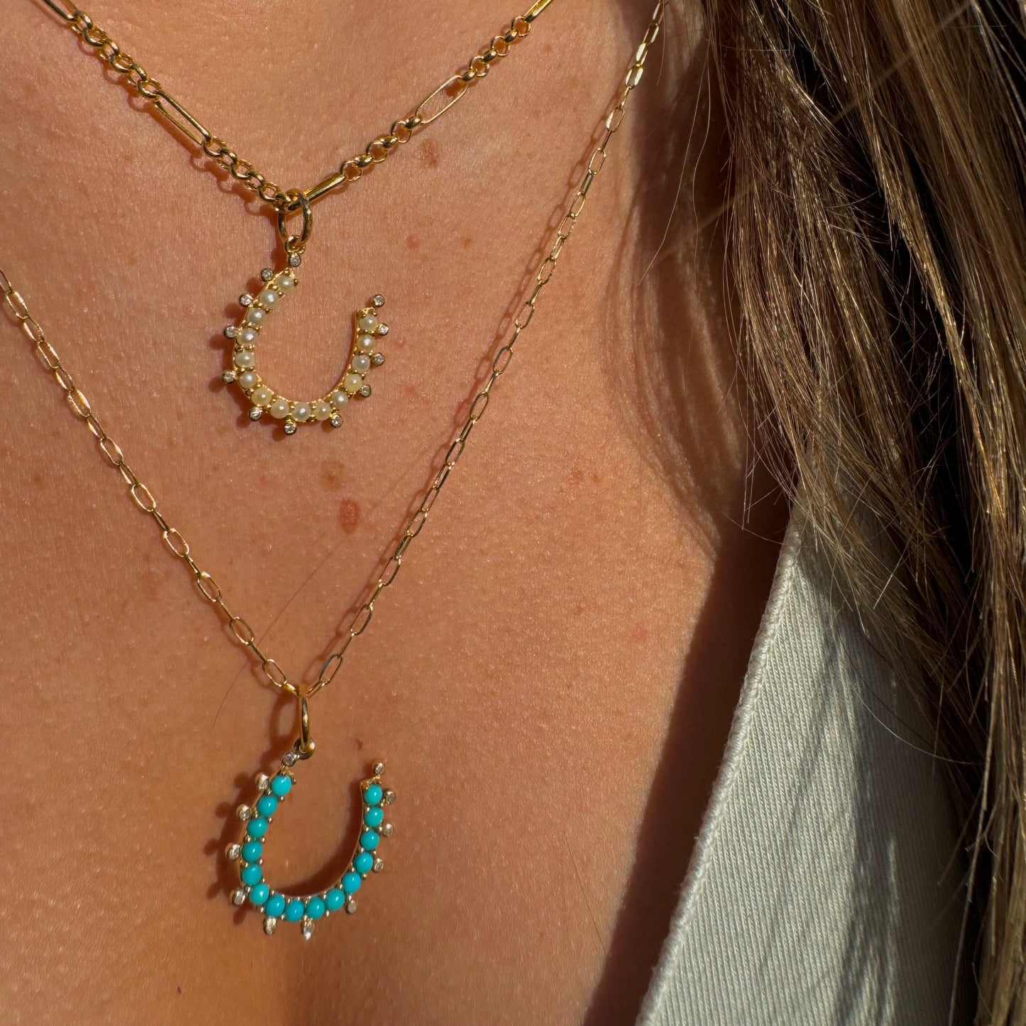 Add a little luck to your style with THE LUCKIEST CHARM! Made with a gold horseshoe charm and embellished with pearls or turquoise, our horsehoe charm is thought to attract luck and ward off negativity.