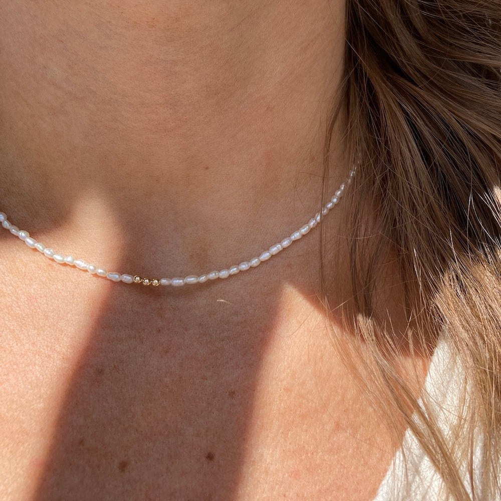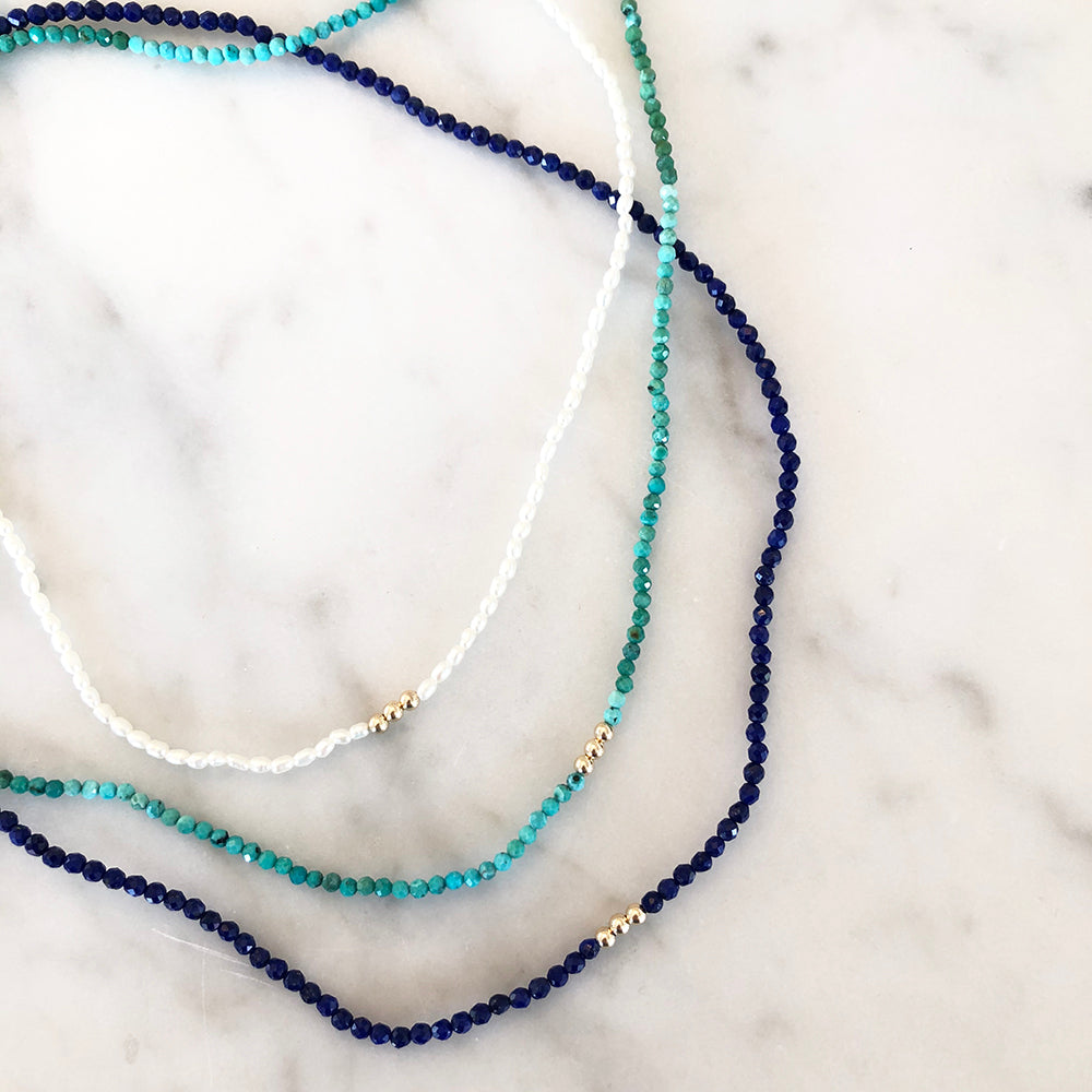 Details: 16" in length, features a 14k yellow gold clasp and three centered 14k yellow gold wishing beads.