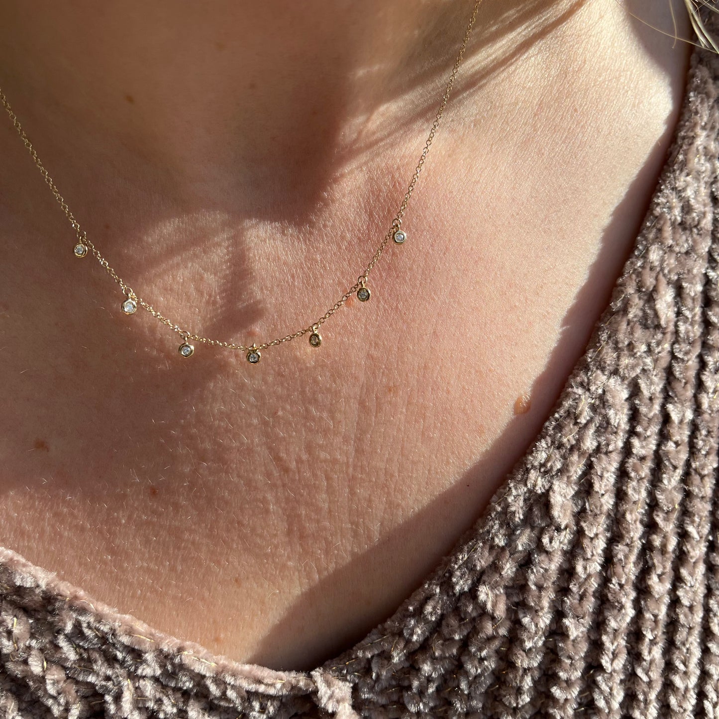 This STARBORN bezel-set station necklace boasts seven dazzling diamonds, making it a versatile and elegant addition to any wardrobe. Perfect for adding a touch of glamour to any outfit, this necklace is expertly crafted and designed to highlight the natural beauty of the diamonds.