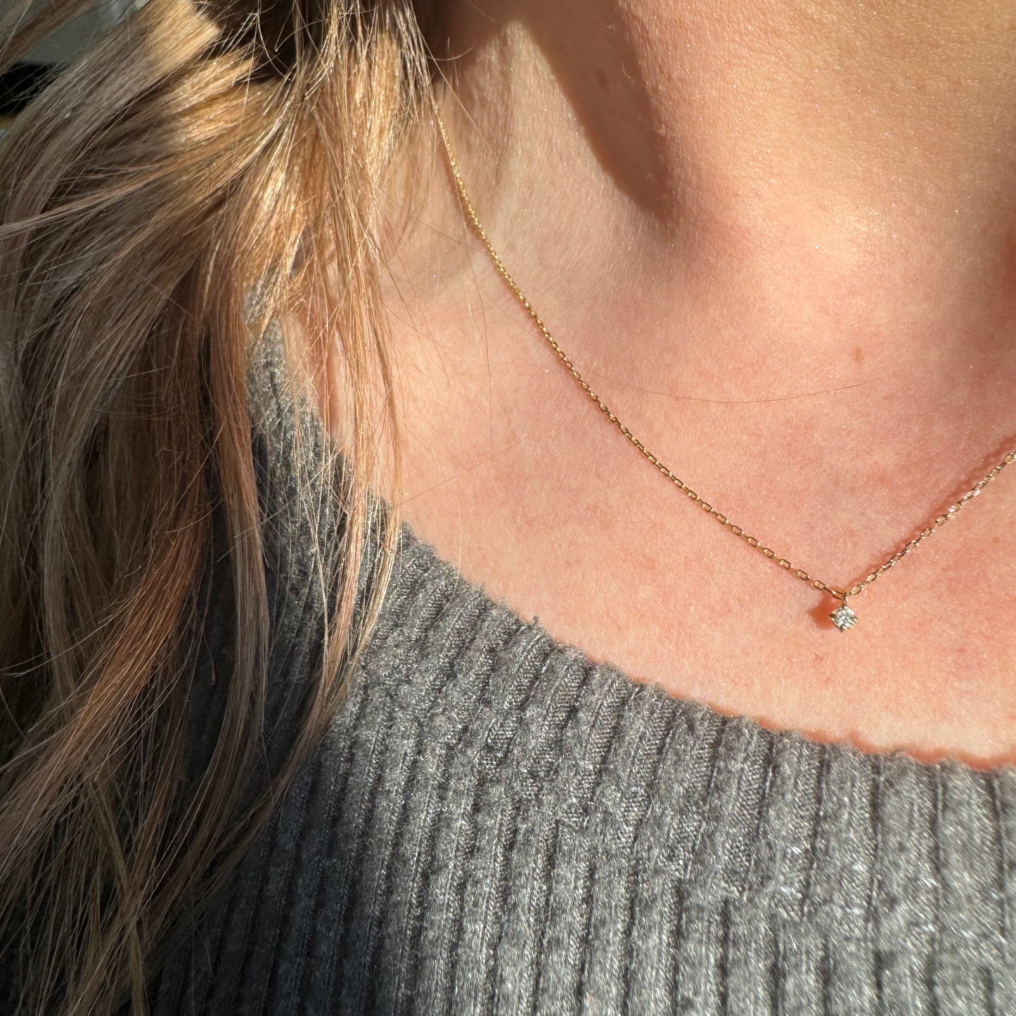 Introducing our TINY DEW DROP NECKLACE - the perfect piece for adding a subtle sparkle to any outfit. With a delicate and dainty necklace design, this piece features a tiny diamond that will catch the light just right and add a touch of elegance to your look. Trust our expertise in crafting high-quality, beautiful jewelry.