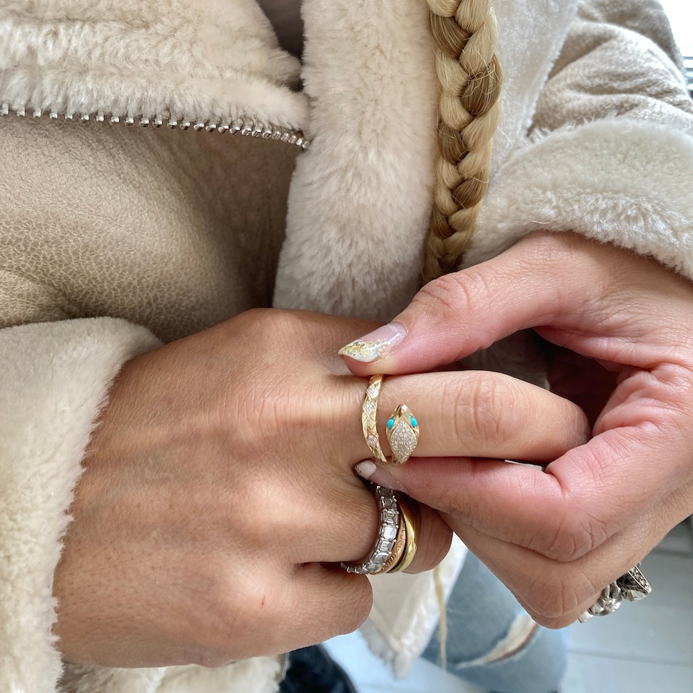 This intricately detailed statement ring is sure to wow you with its engraved diamond scale pattern, turquoise eyes, and a larger diamond headpiece.