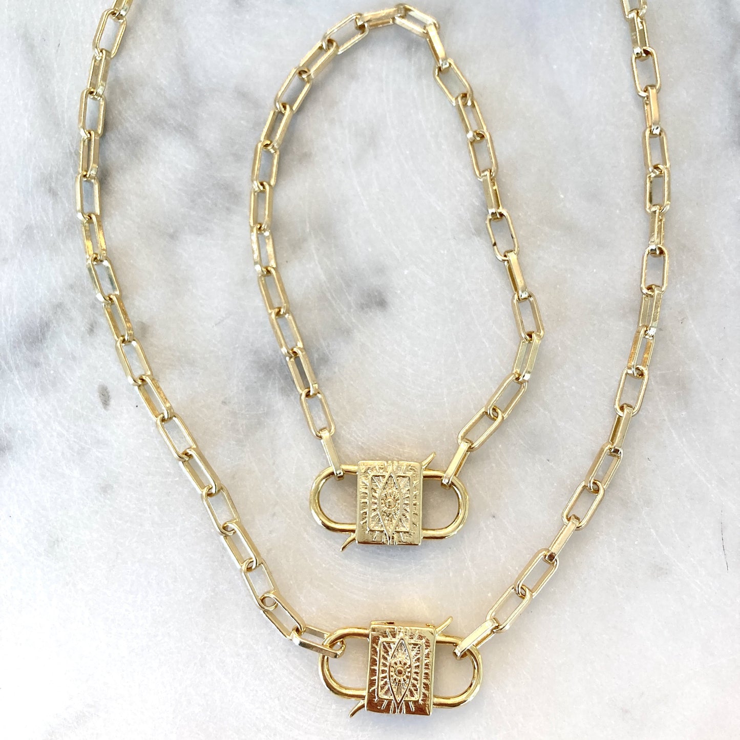 We took our best selling paperclip chain and added a special touch. This evil eye lock makes the perfect charm & clasp. The amulet protects against any evil and negative vibes.