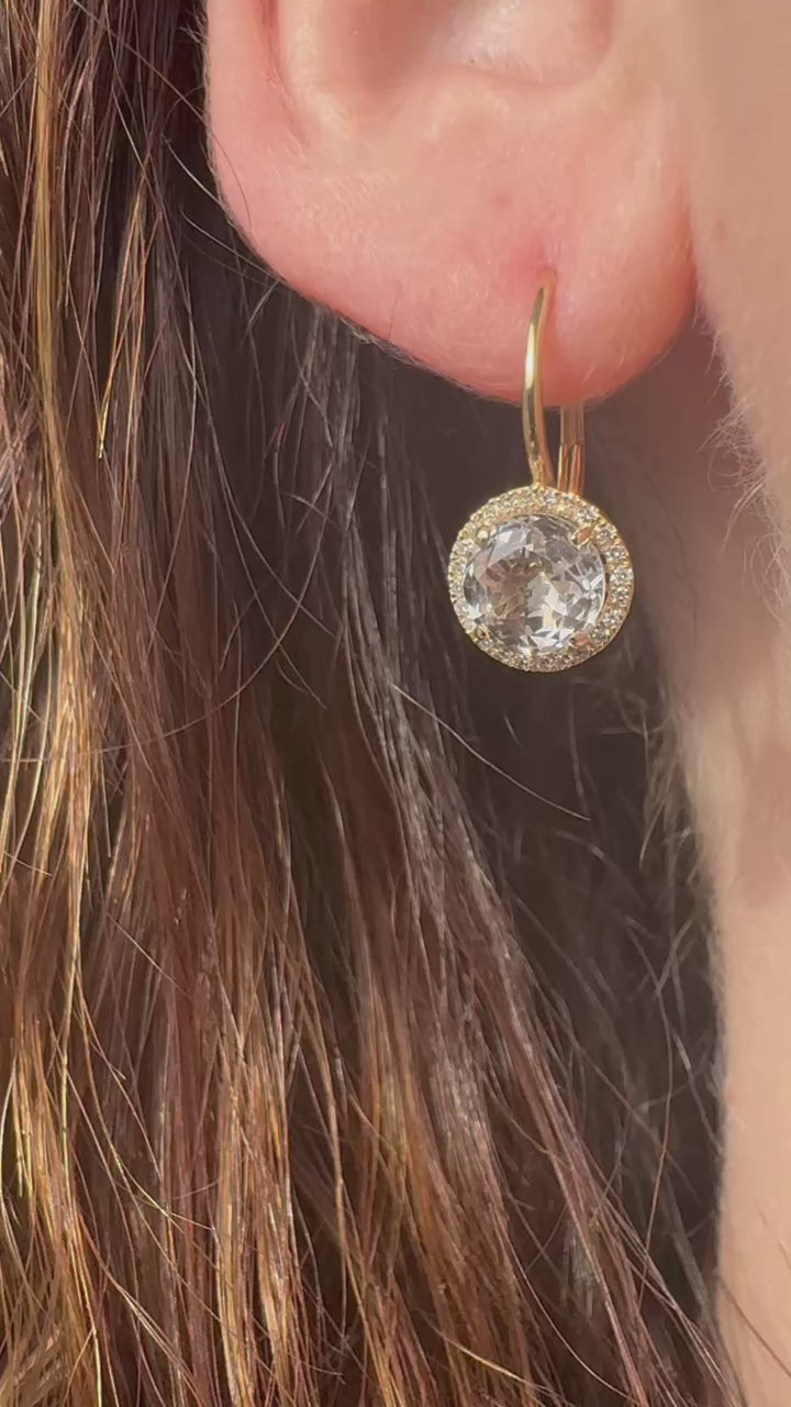 These round brilliant cut earrings are made of 14k gold, 48 diamonds totaling 0.16 cts and two emerald cut white topaz stones totaling 2.60 cts
