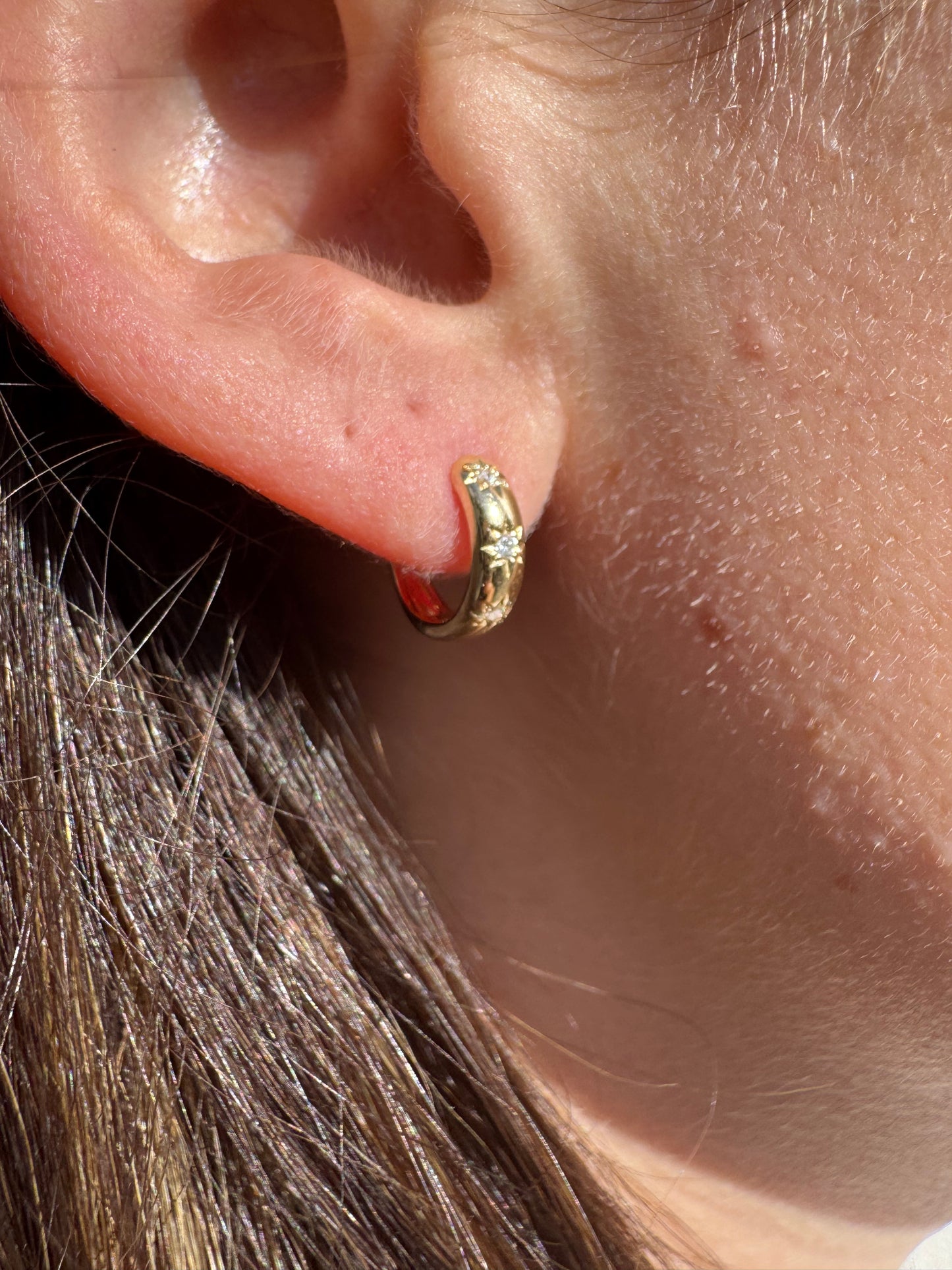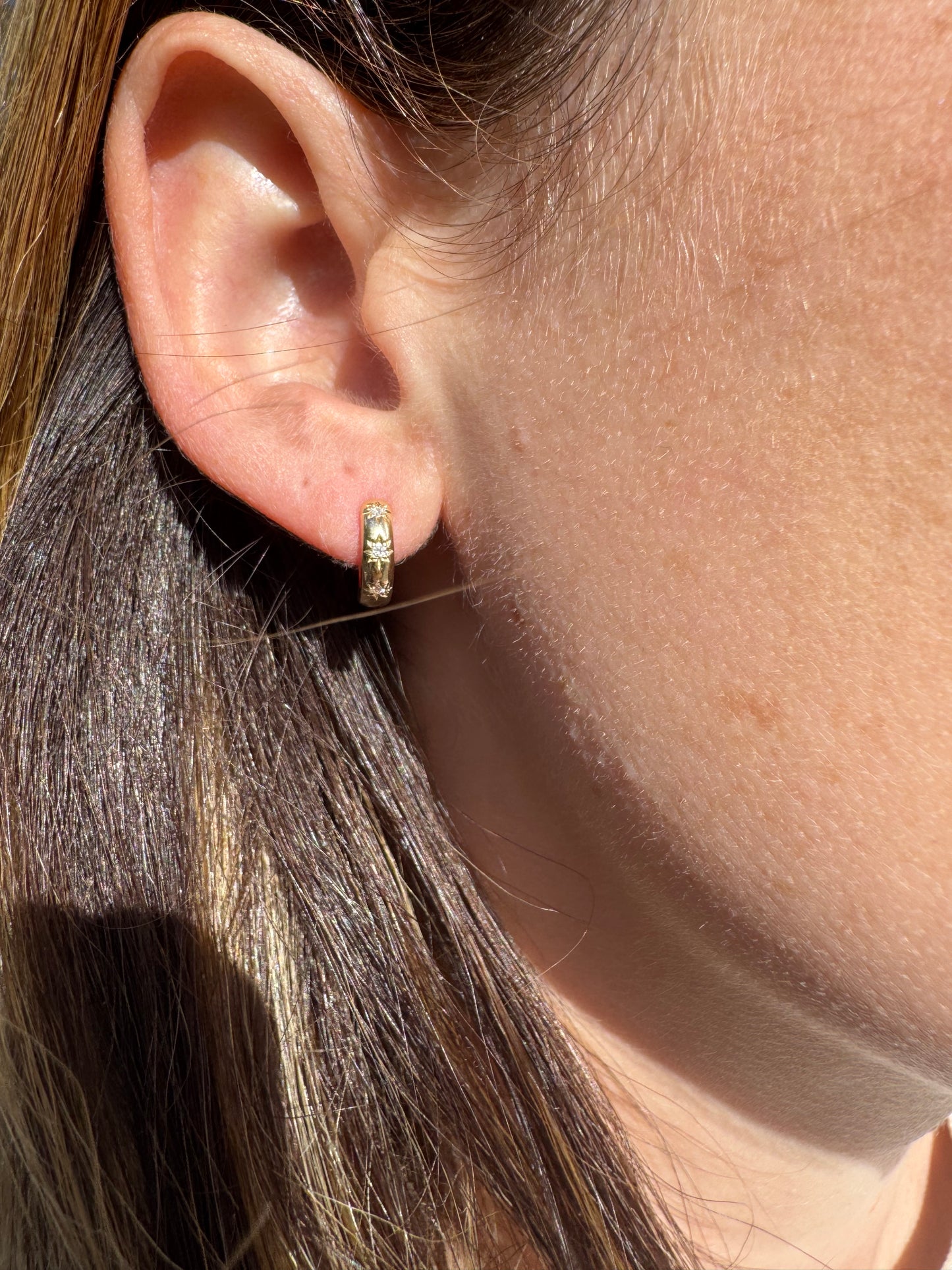 These engraved starburst & flush set diamonds adorn these perfect huggie hoops. Inspired by the intense love between Daenerys Targaryen and Khal Drogo. We love these as your everyday earrings but don't hesitate wearing them out on date night too!