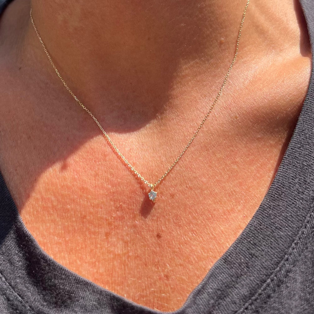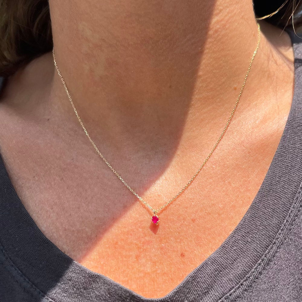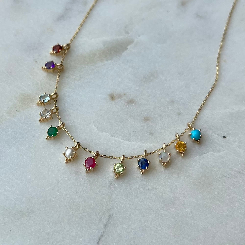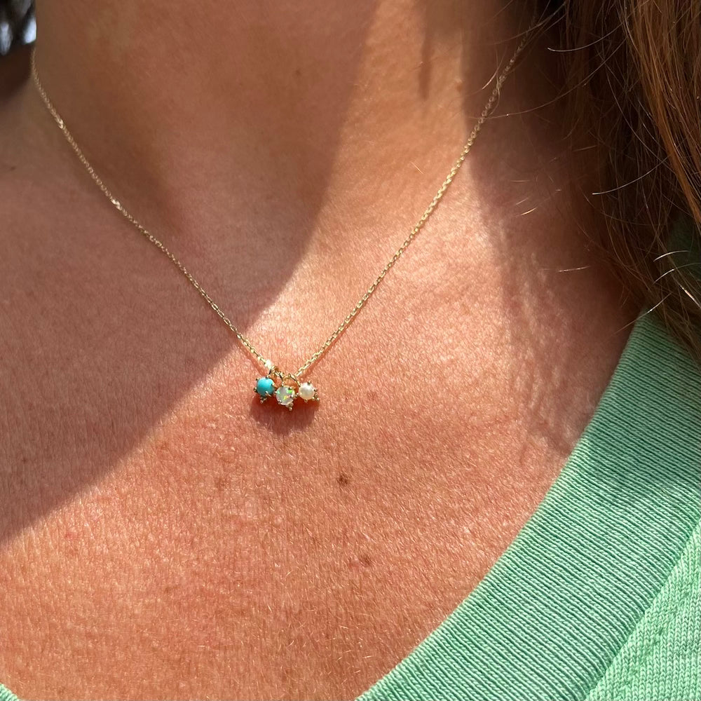 A 3mm gemstone of your choice is nestled into a 14k gold, 4-prong setting with a cluster of three gold beads at the bottom for good luck.