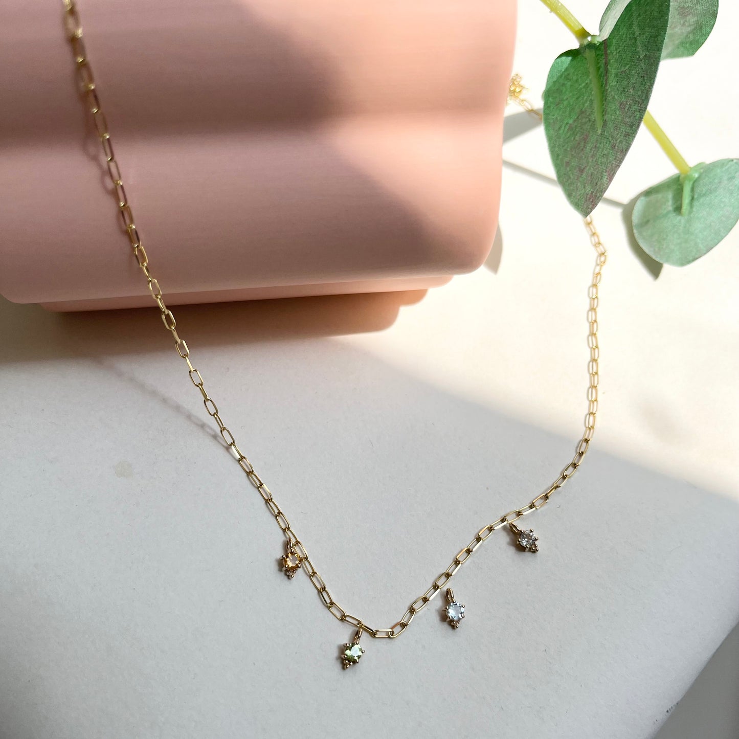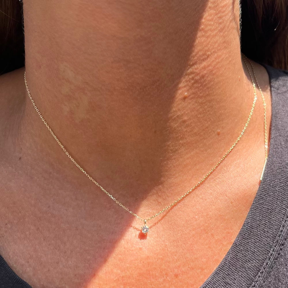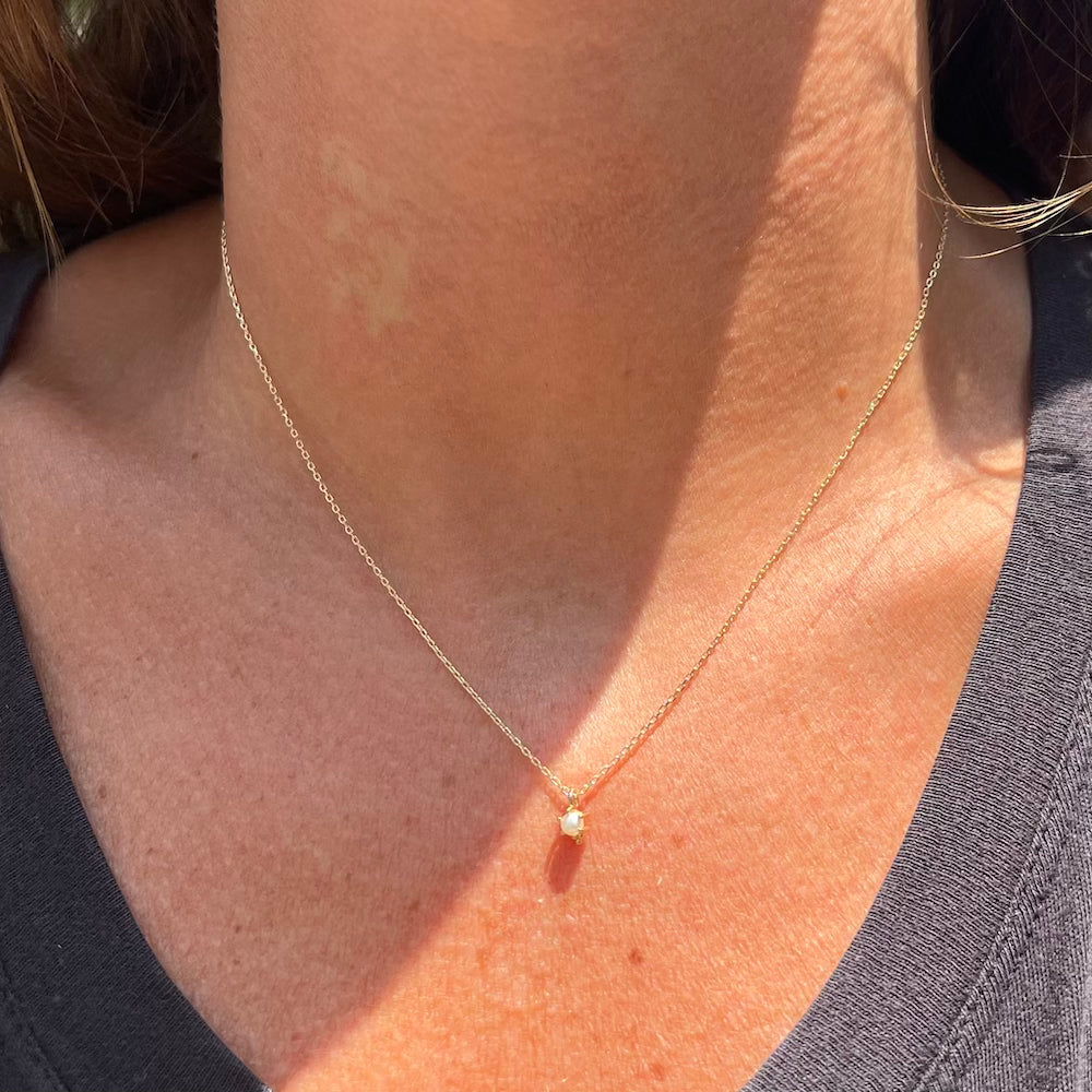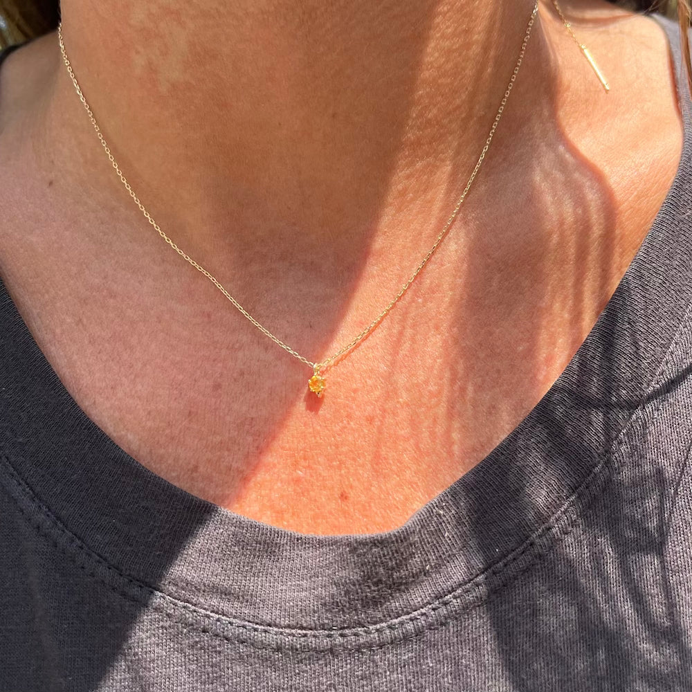 A 3mm gemstone of your choice is nestled into a 14k gold, 4-prong setting with a cluster of three gold beads at the bottom for good luck.