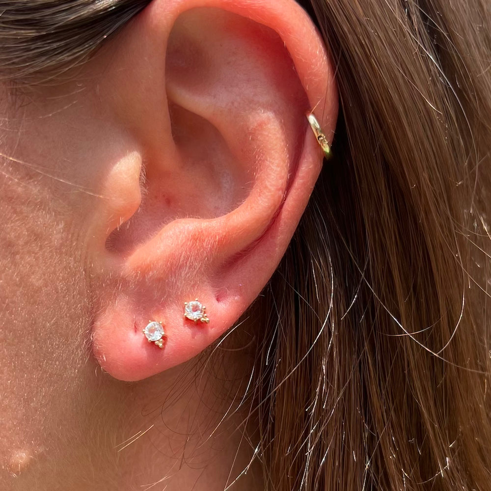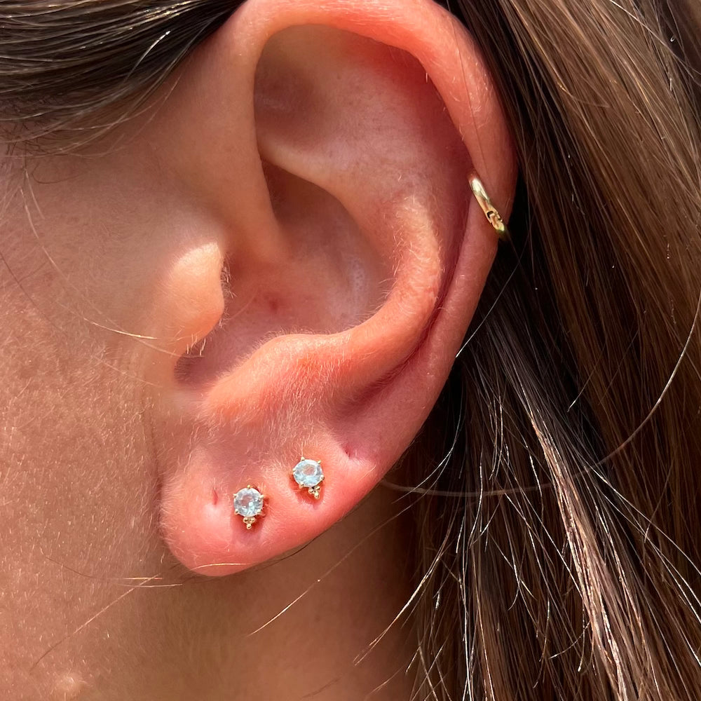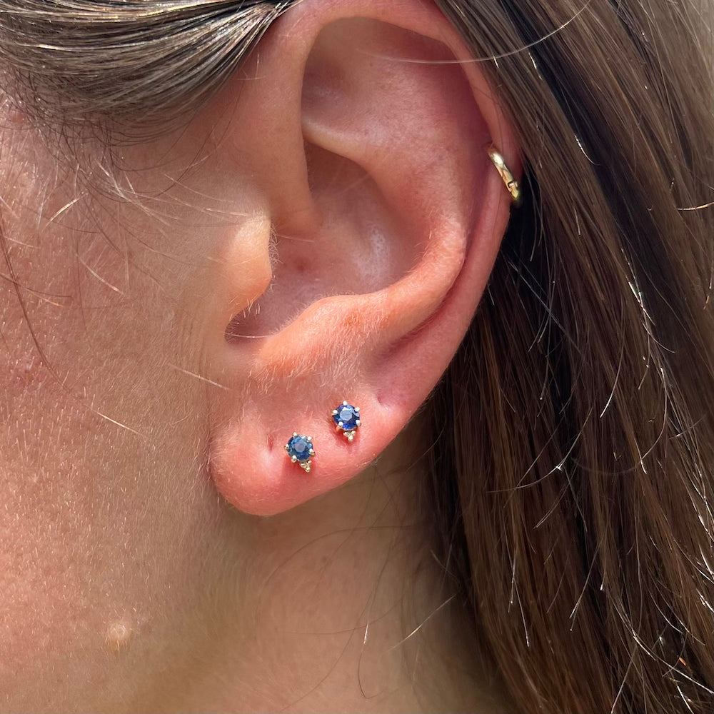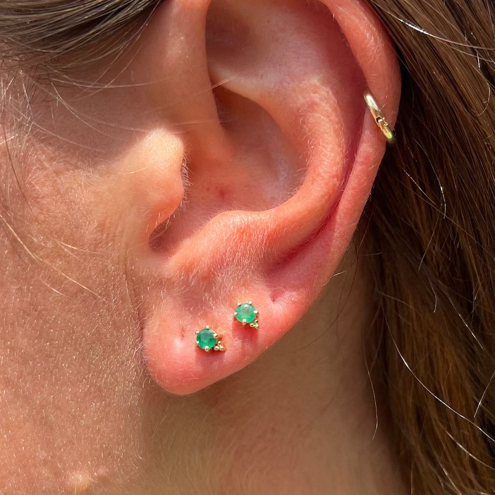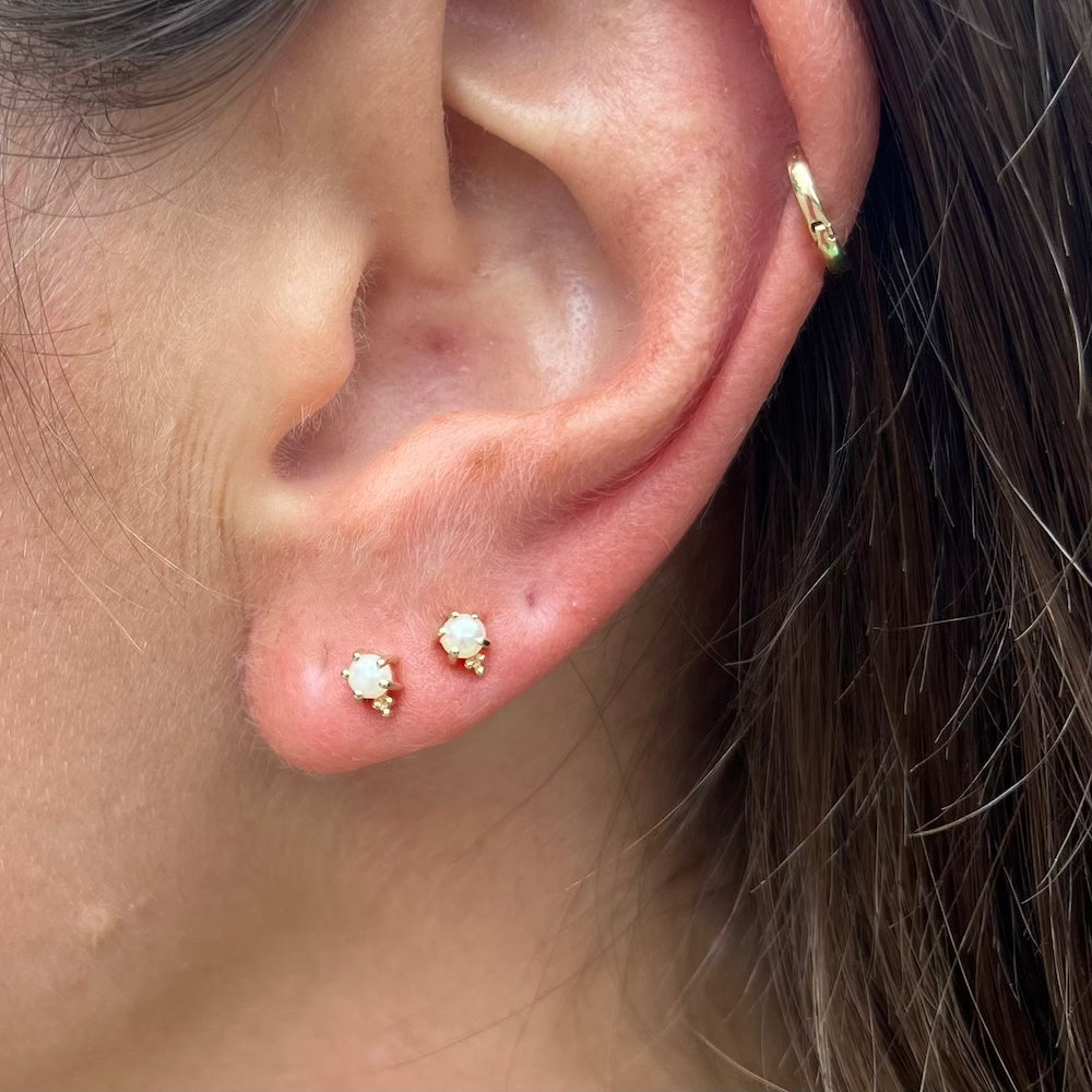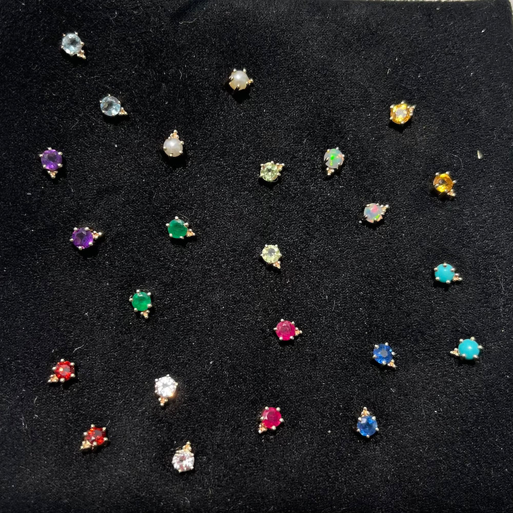 A 3mm gemstone of your choice is nestled into a 14k gold, 5-prong setting with a cluster of three gold beads at the bottom.
