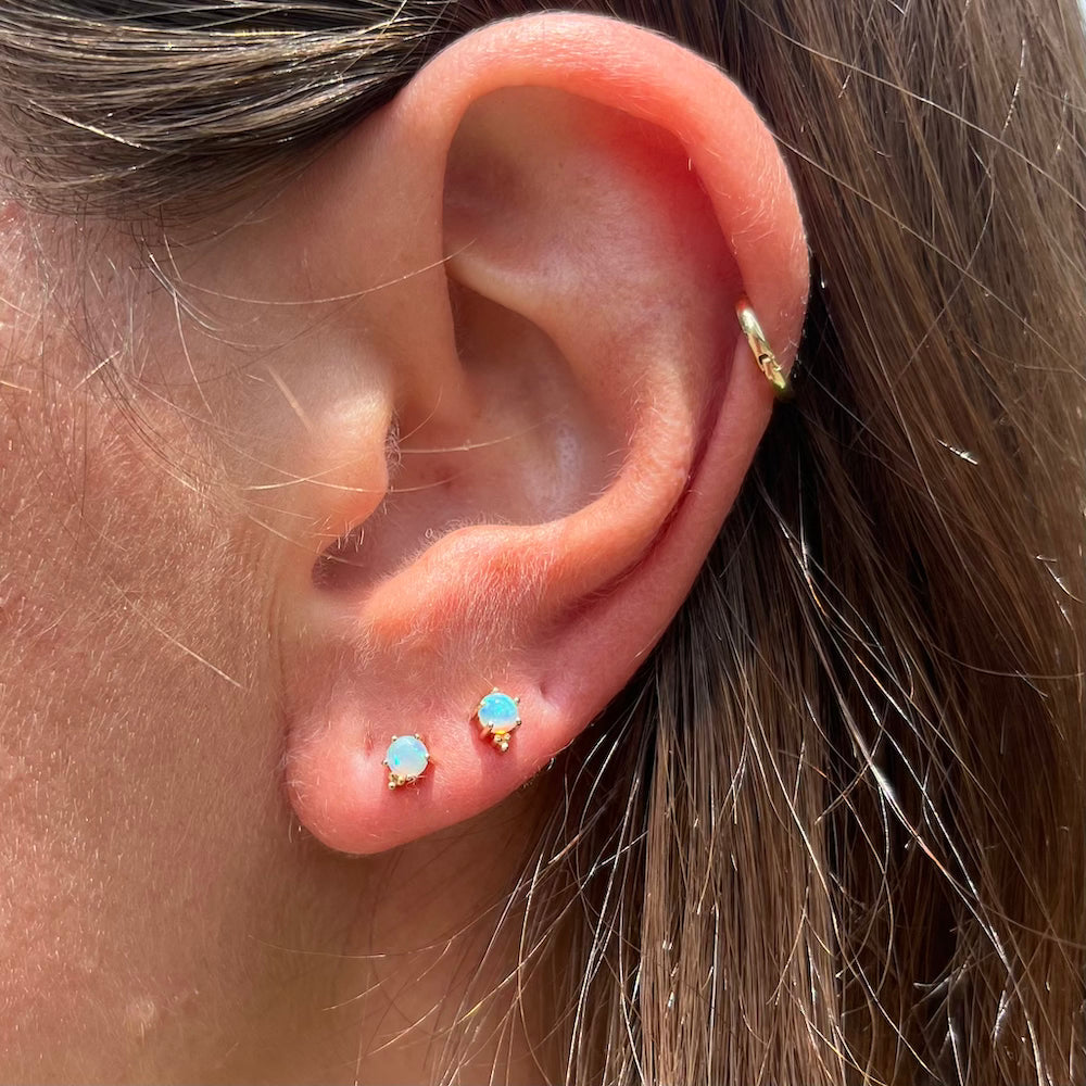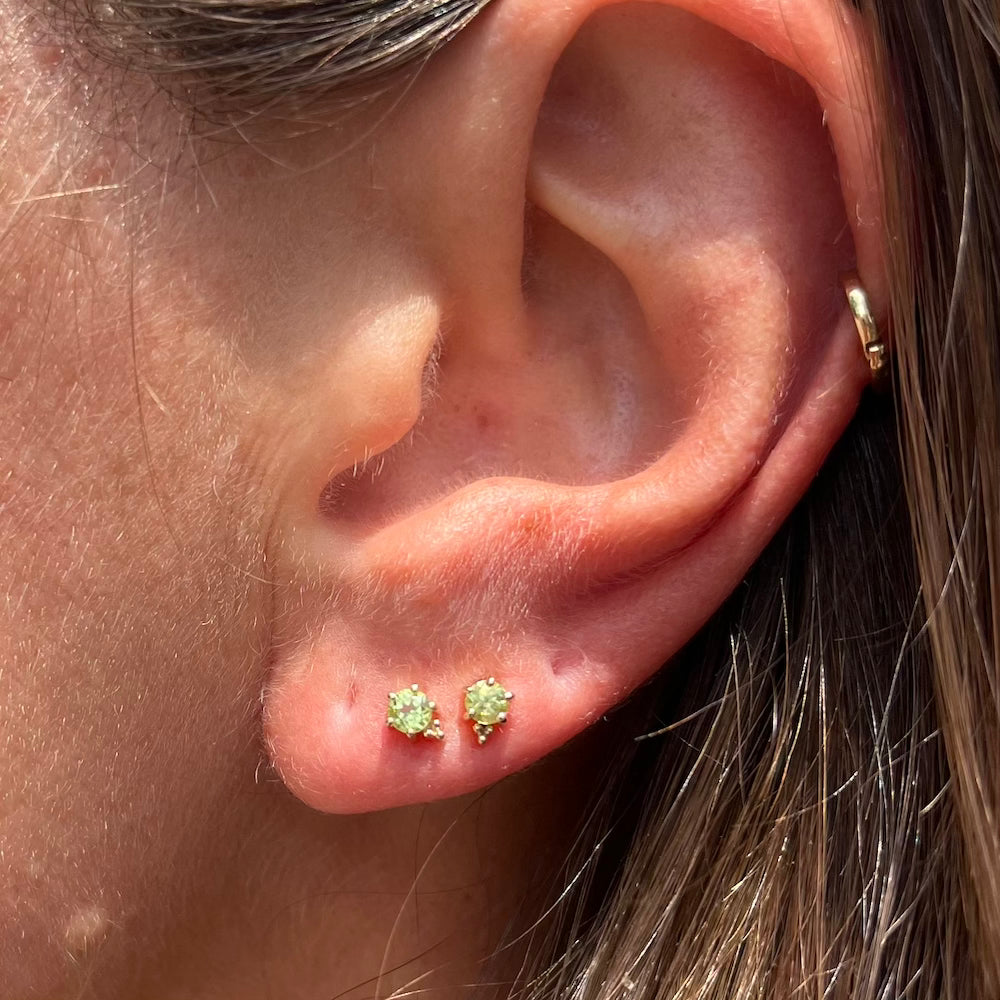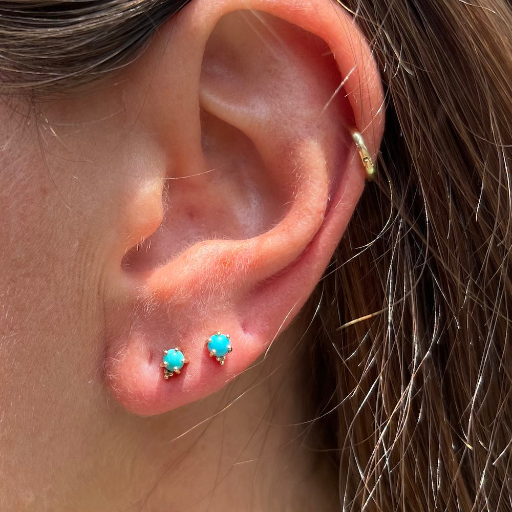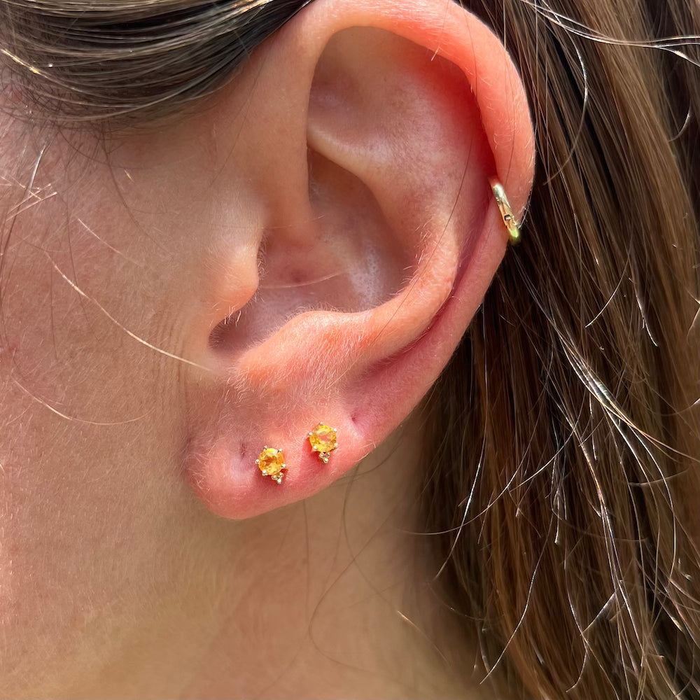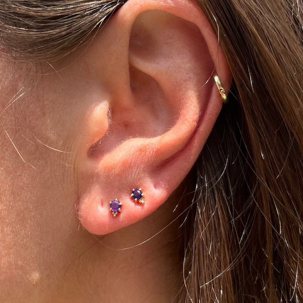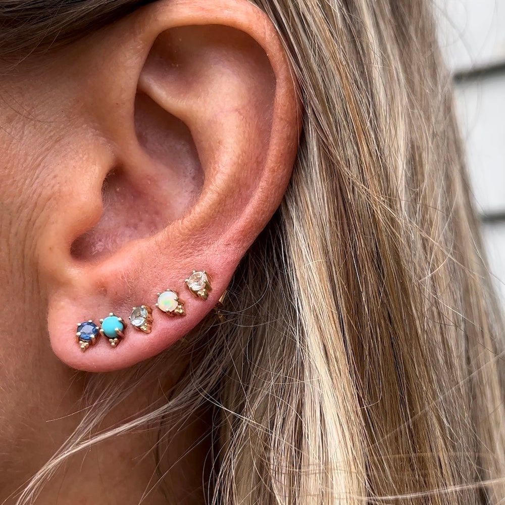 A 3mm gemstone of your choice is nestled into a 14k gold, 5-prong setting with a cluster of three gold beads at the bottom.