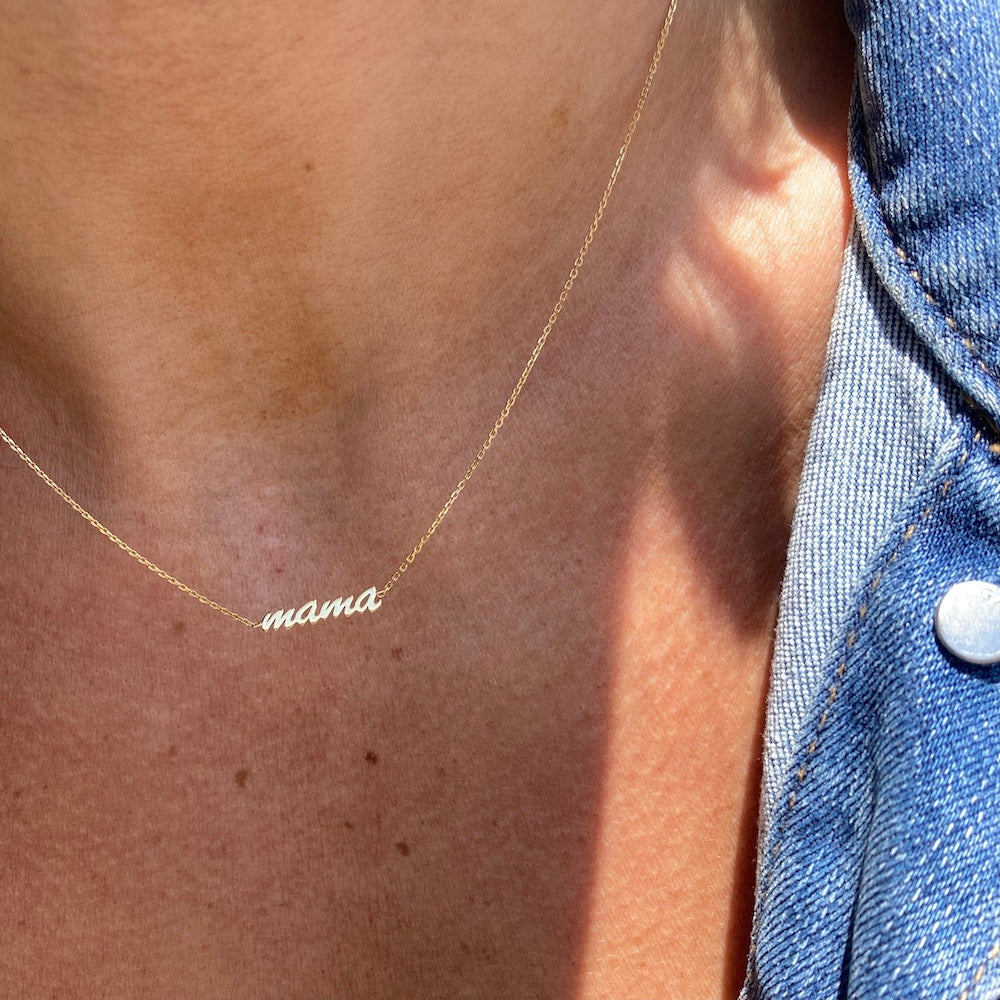 This 14k yellow gold necklace features 'mama' written in script. Meant to be worn as a choker around 13-15" but can be worn as long as 17" with an easily adjustable slide bead.