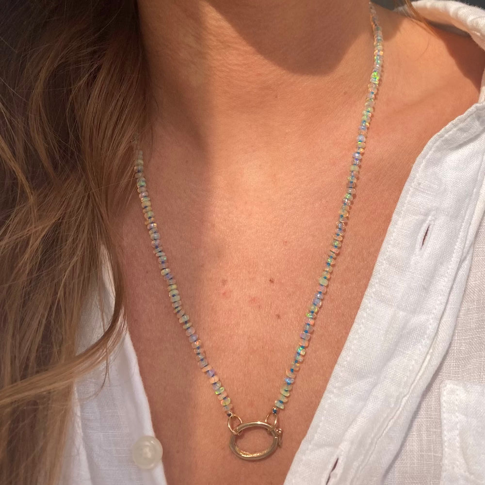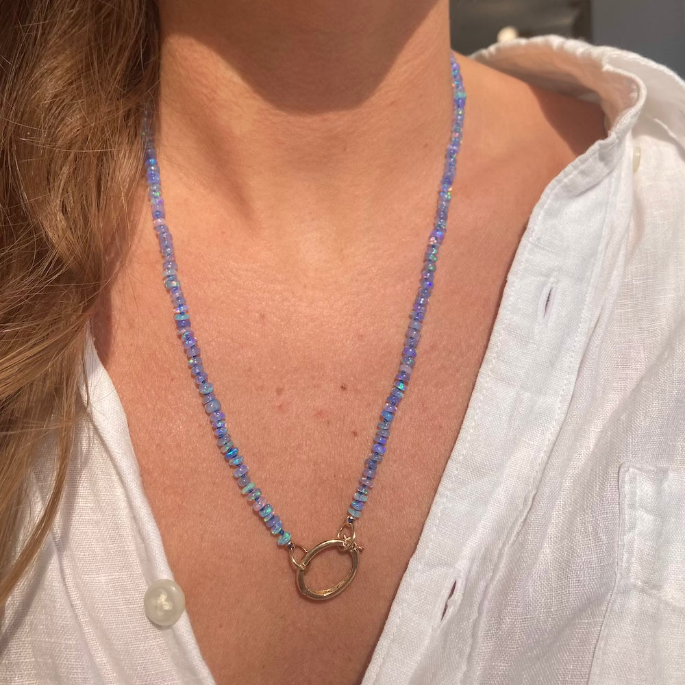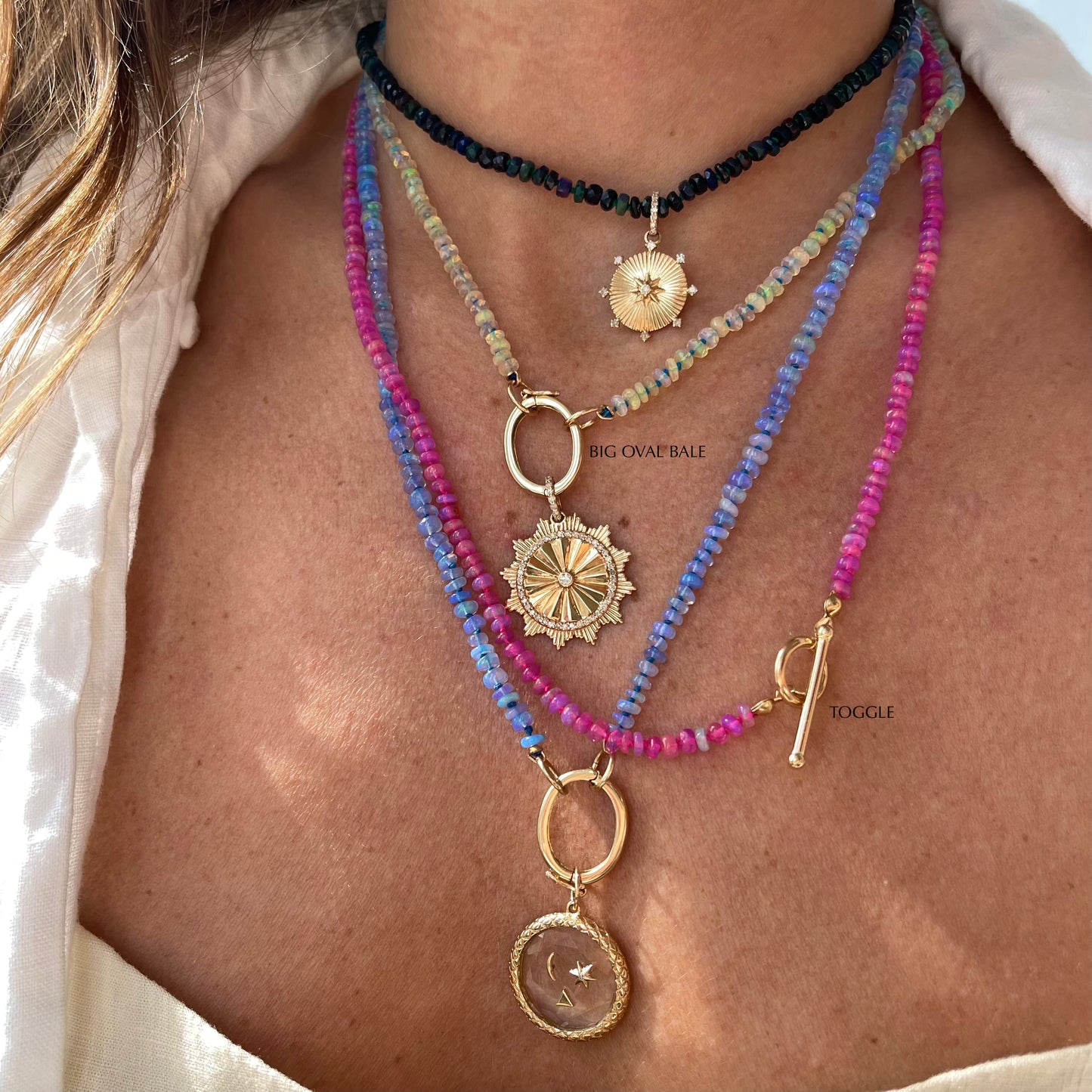 Look closely and you will see a whole universe inside each one of these magical opal beads. Unique and one of a kind opals are strung on a colorful thread with 14K gold toggles and bails. Designed to put charms on or can be worn on their own.