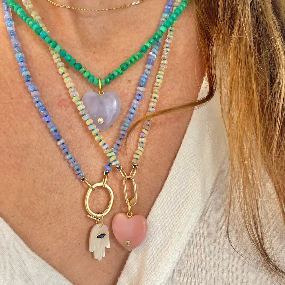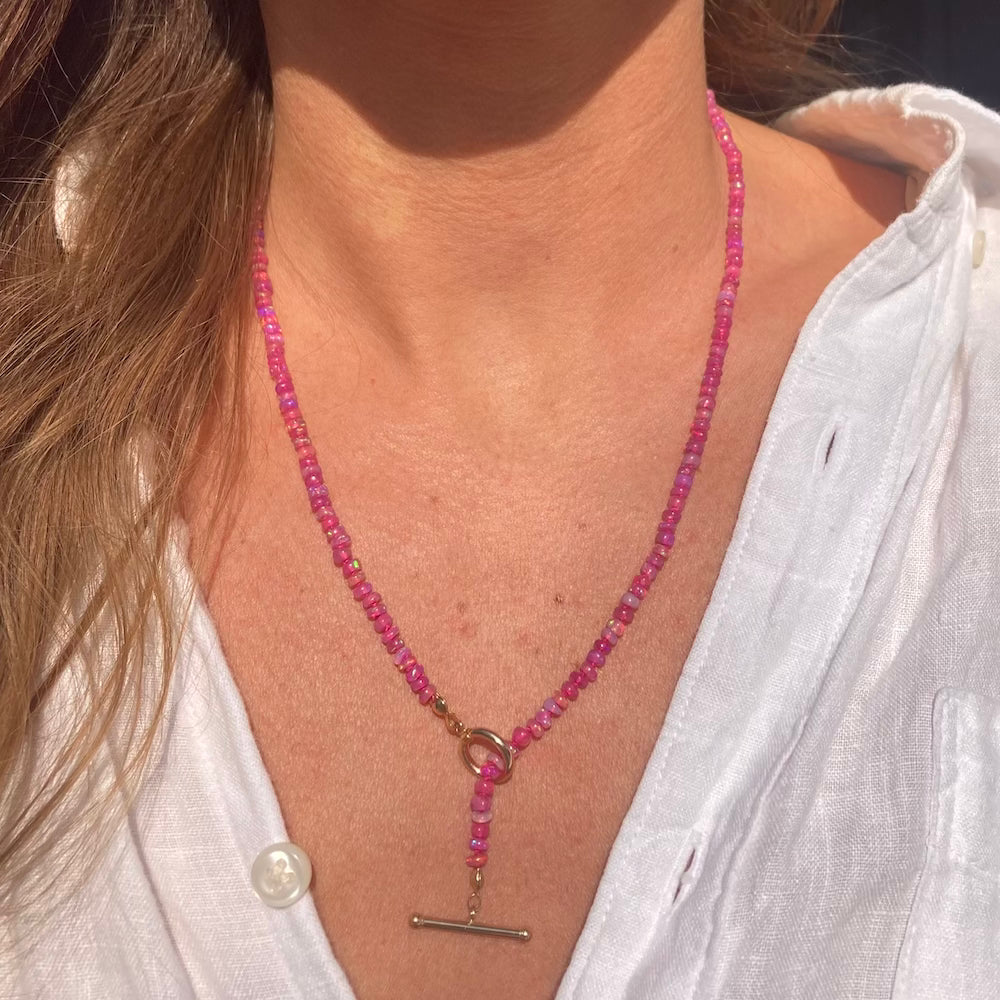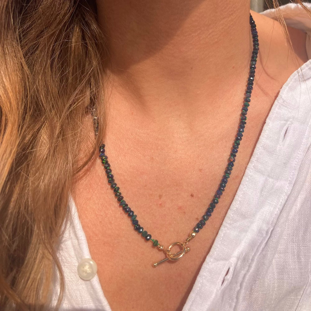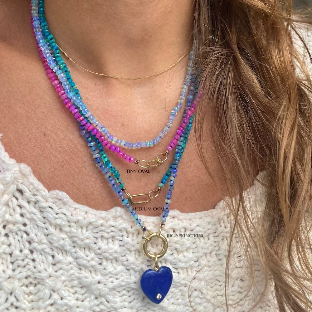Look closely and you will see a whole universe inside each one of these magical opal beads. Unique and one of a kind opals are strung on a colorful thread with 14K gold toggles and bails. Designed to put charms on or can be worn on their own.