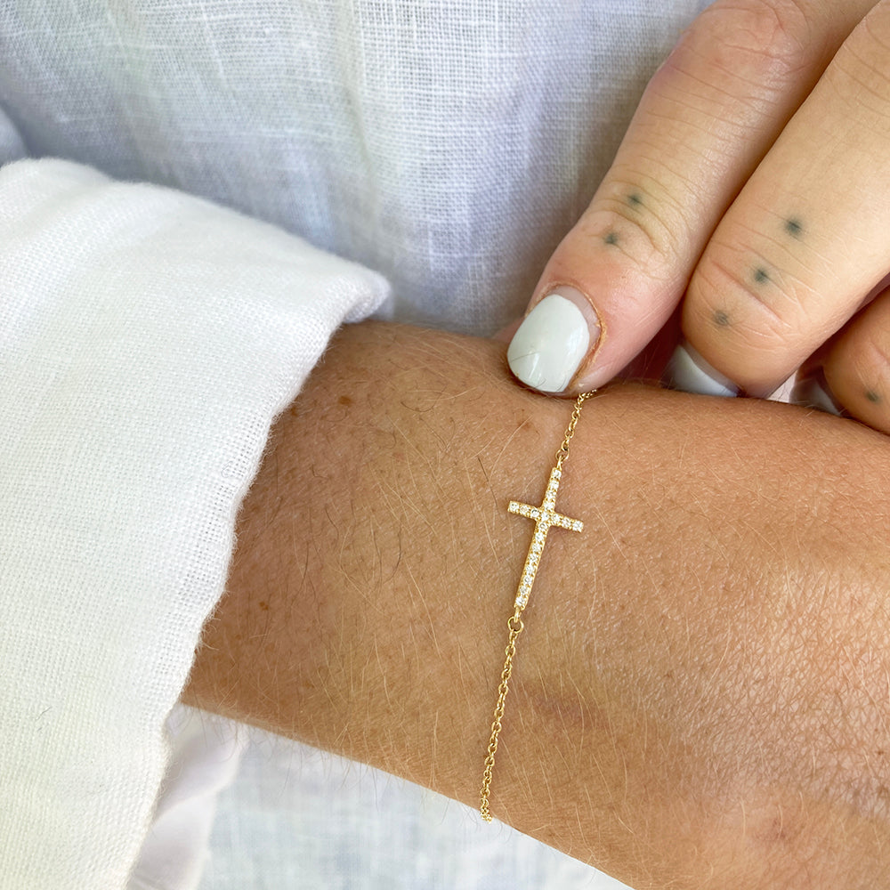 This symbolic gold and diamond cross bracelet is set in 14k yellow gold.