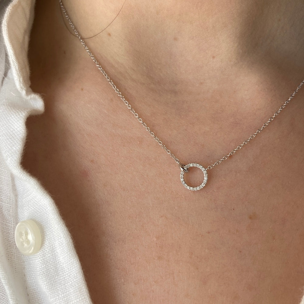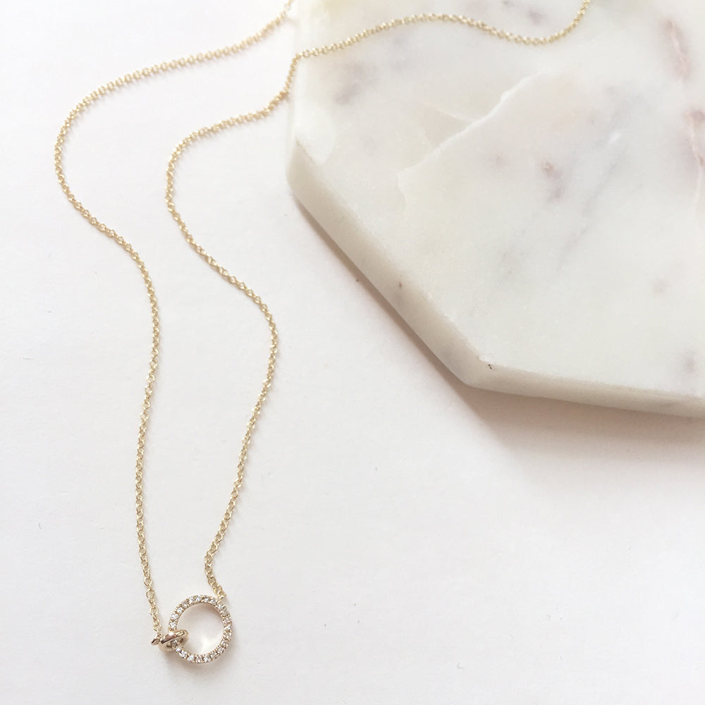 This 14k gold and diamond interlocking necklace features 23 diamonds for a tcw of 0.06.