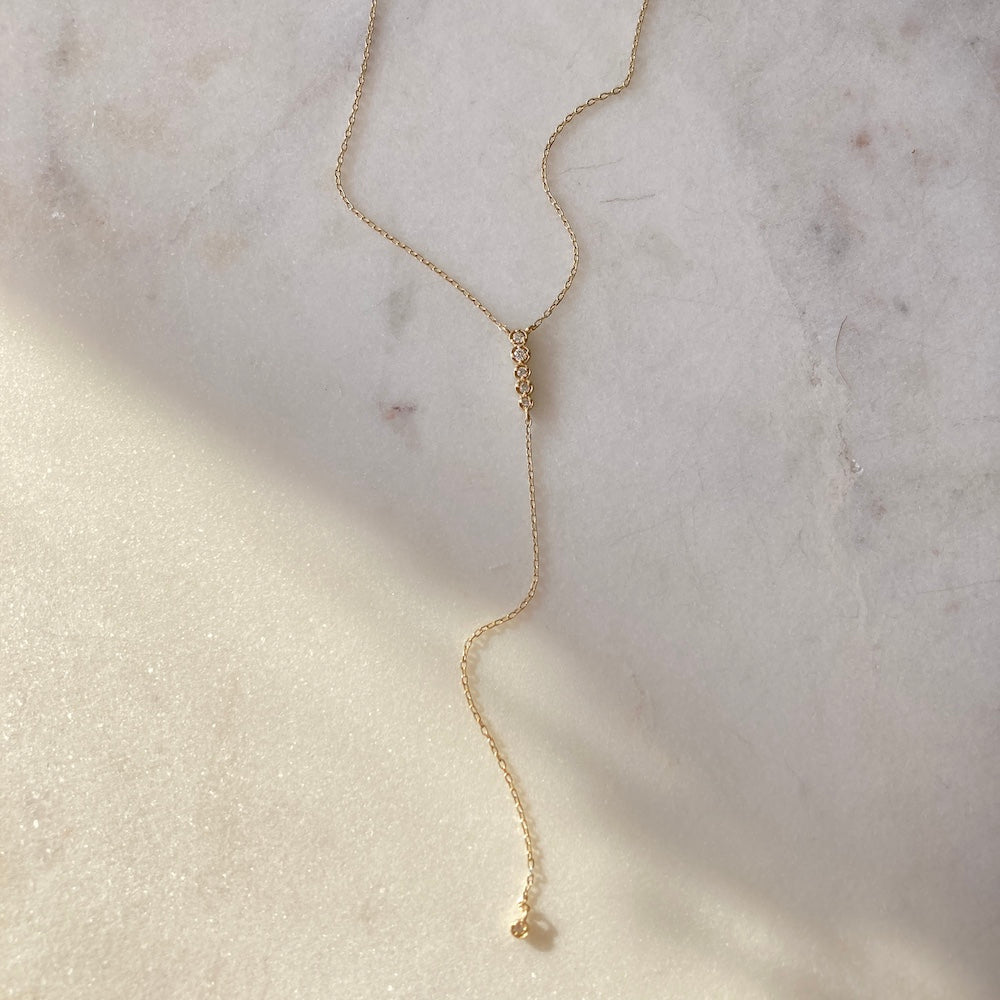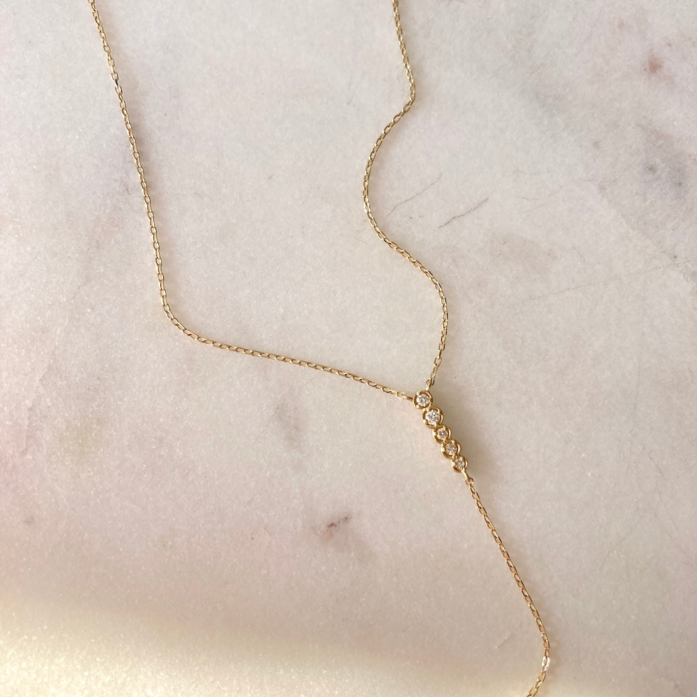 This 14k gold lariat style necklace with cascading diamond is the perfect combo of delicate, elegant and cool. One 1.1mm diamond, three 1.3mm diamonds, one 1.4mm diamond and one 1.6mm diamond.