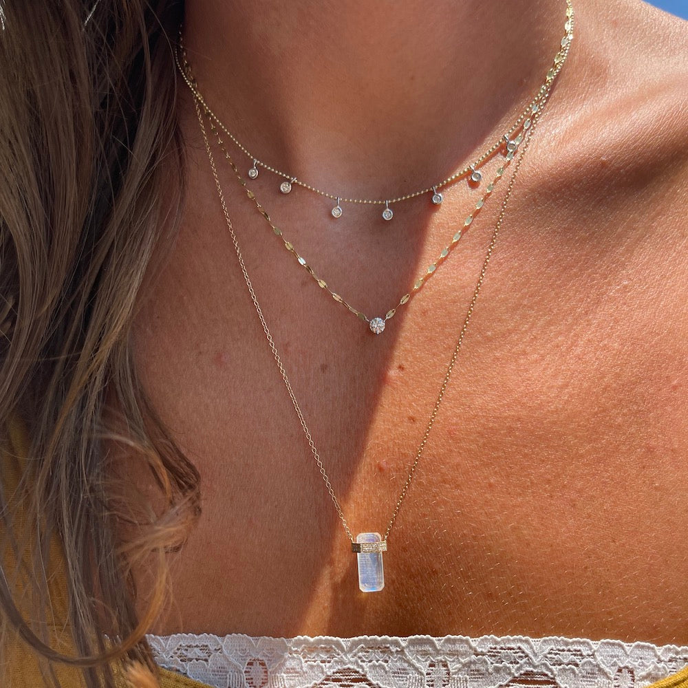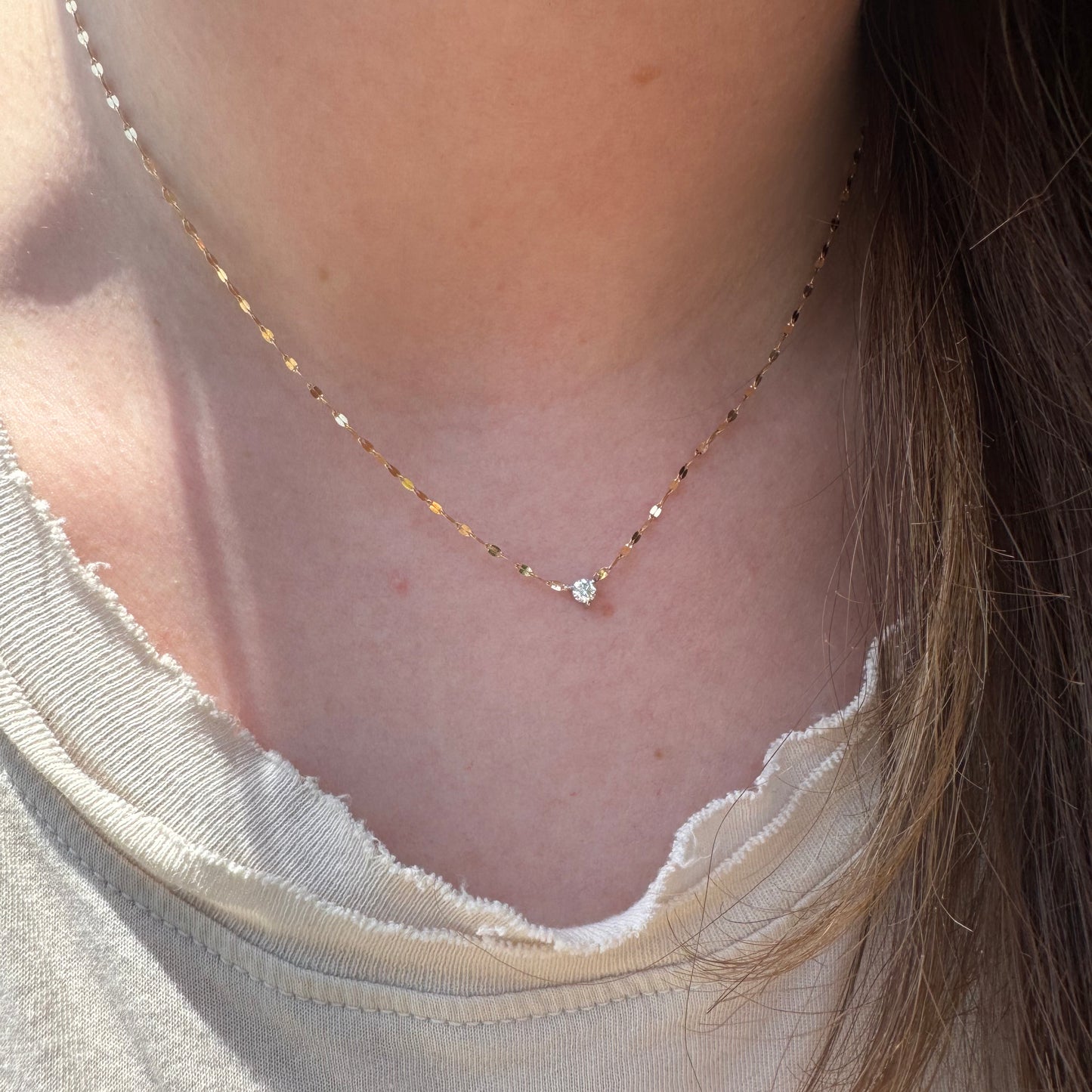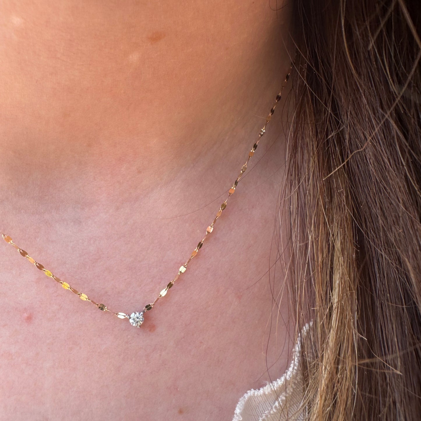 Our one love necklace is the perfect spin on the classic diamond solitaire necklace. A 14k white gold three prong setting gives the illusion of a floating diamond. And - have you SEEN this sparkling designer forzentina chain? It might just be our favorite combo yet.