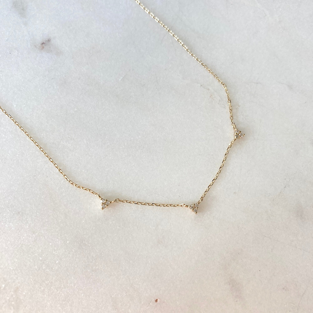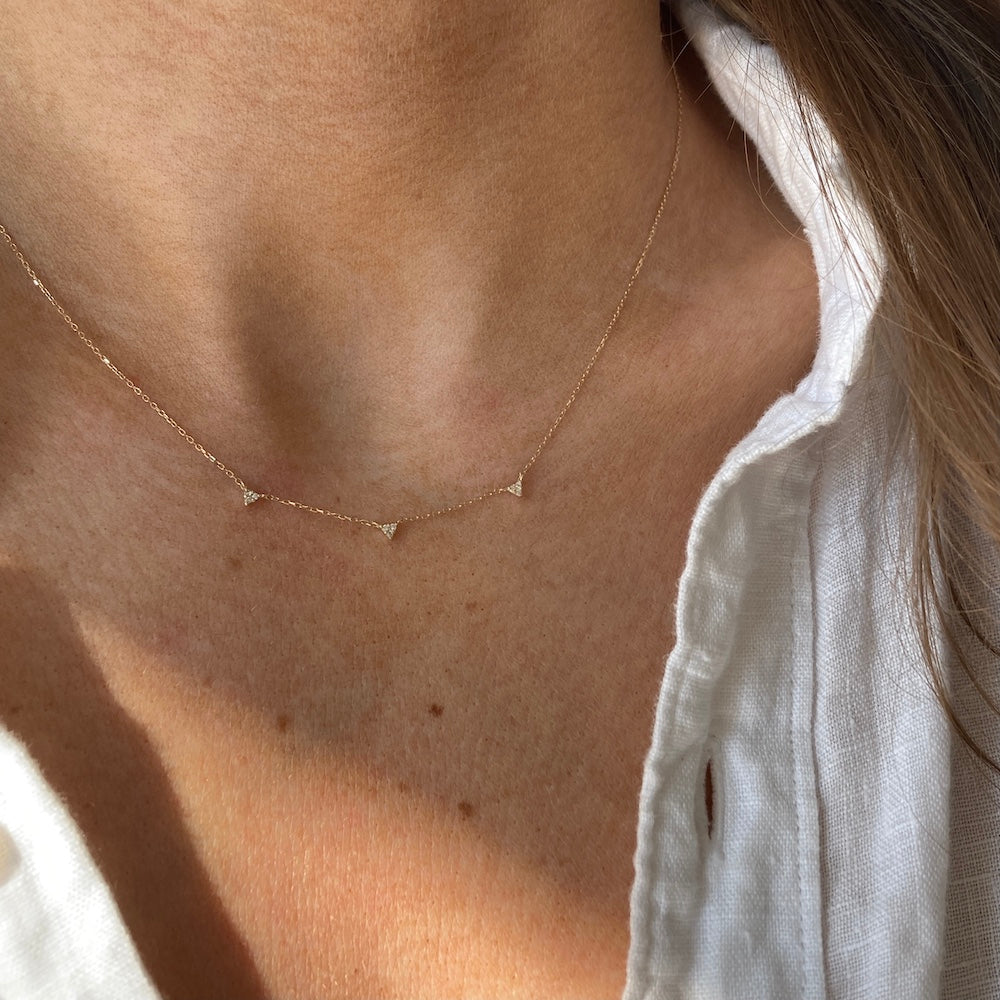 This TROIS Diamond Necklace is manifesting your elevated style! Featuring 14k gold and three 1mm diamonds clustered into a triangle - symbolic of enlightenment, growth and the power to direct your life forward.