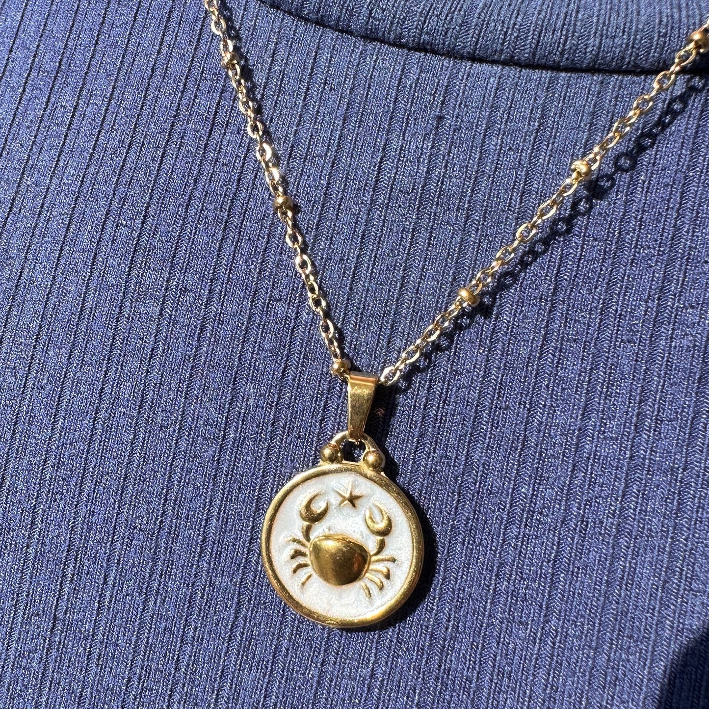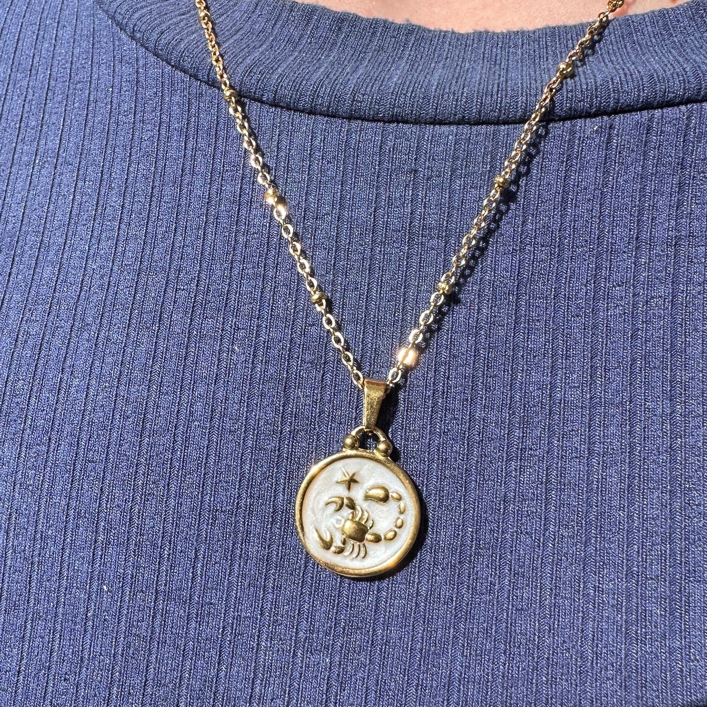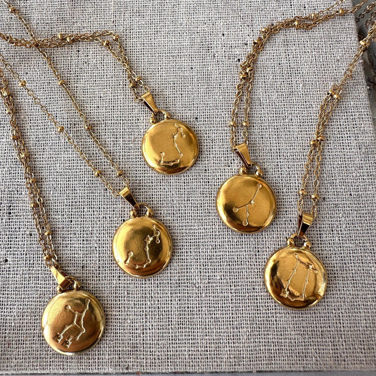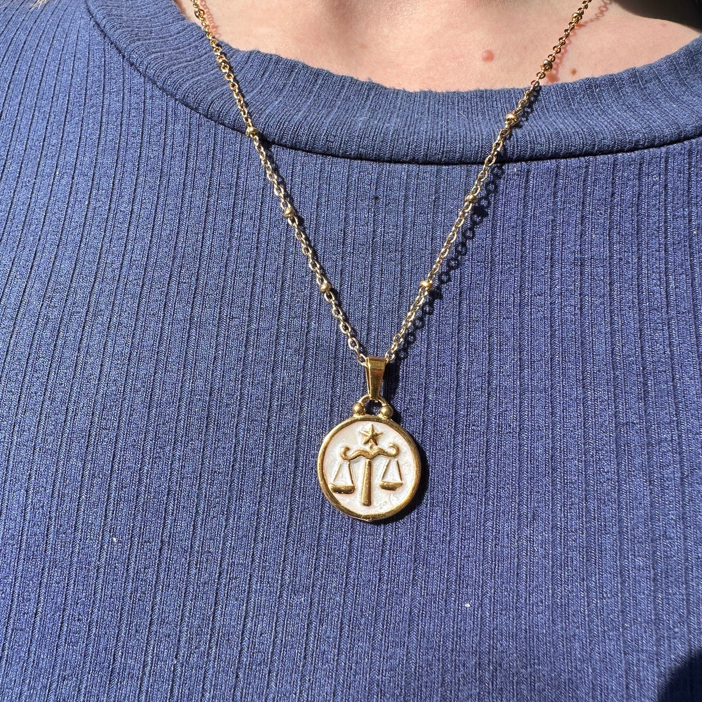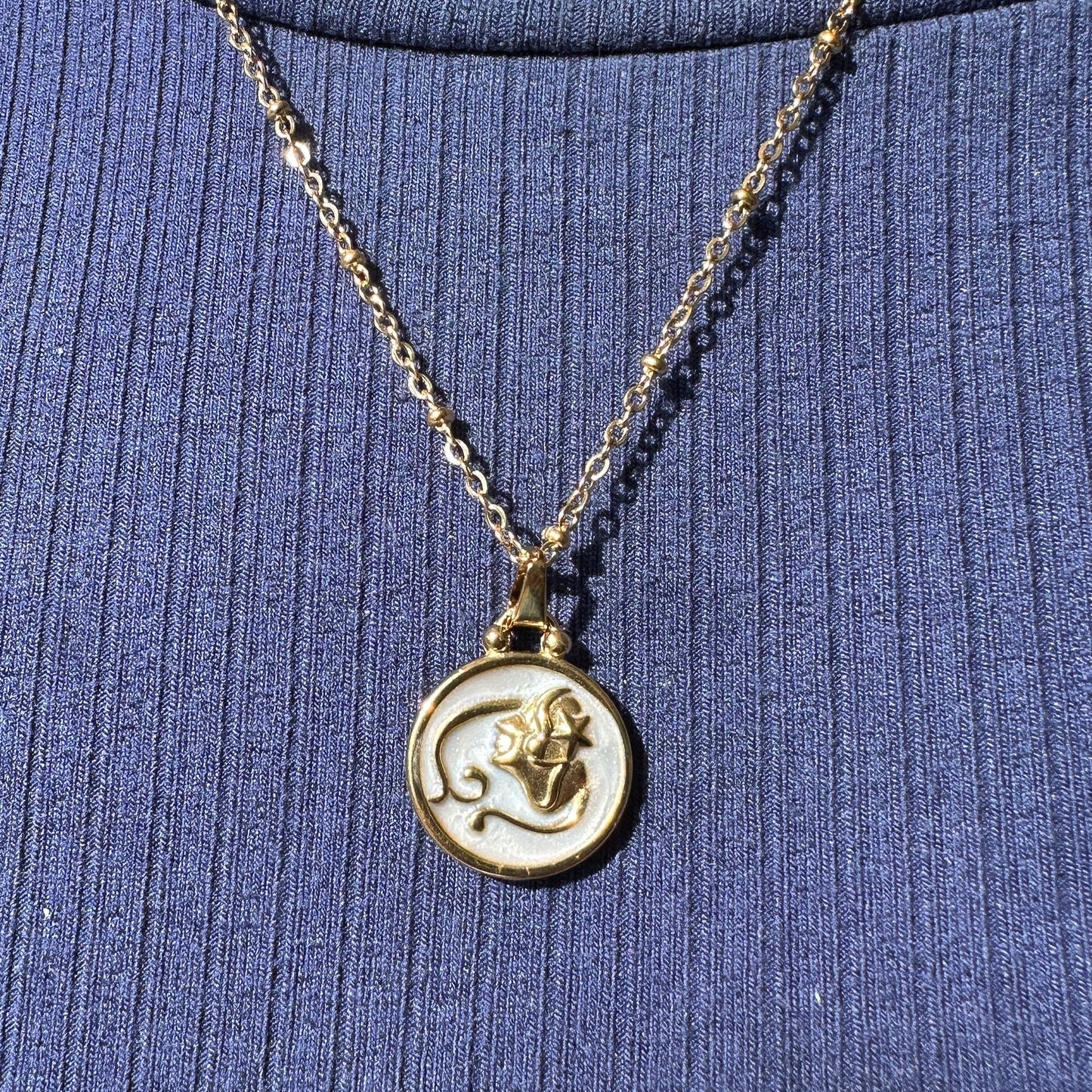 This double-sided necklace features an enamel inlay zodiac-inspired charm on one side, with a coordinating constellation on the back. Suspended from a demi-fine chain accented with delicate gold beads, this piece blends celestial elegance with everyday wearability. A timeless tribute to the stars, perfect for layering or wearing as a personal talisman.