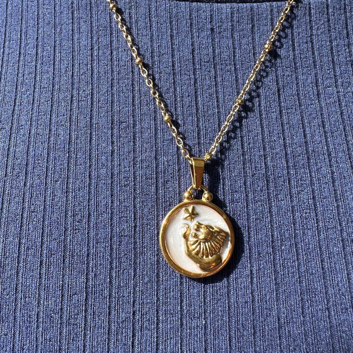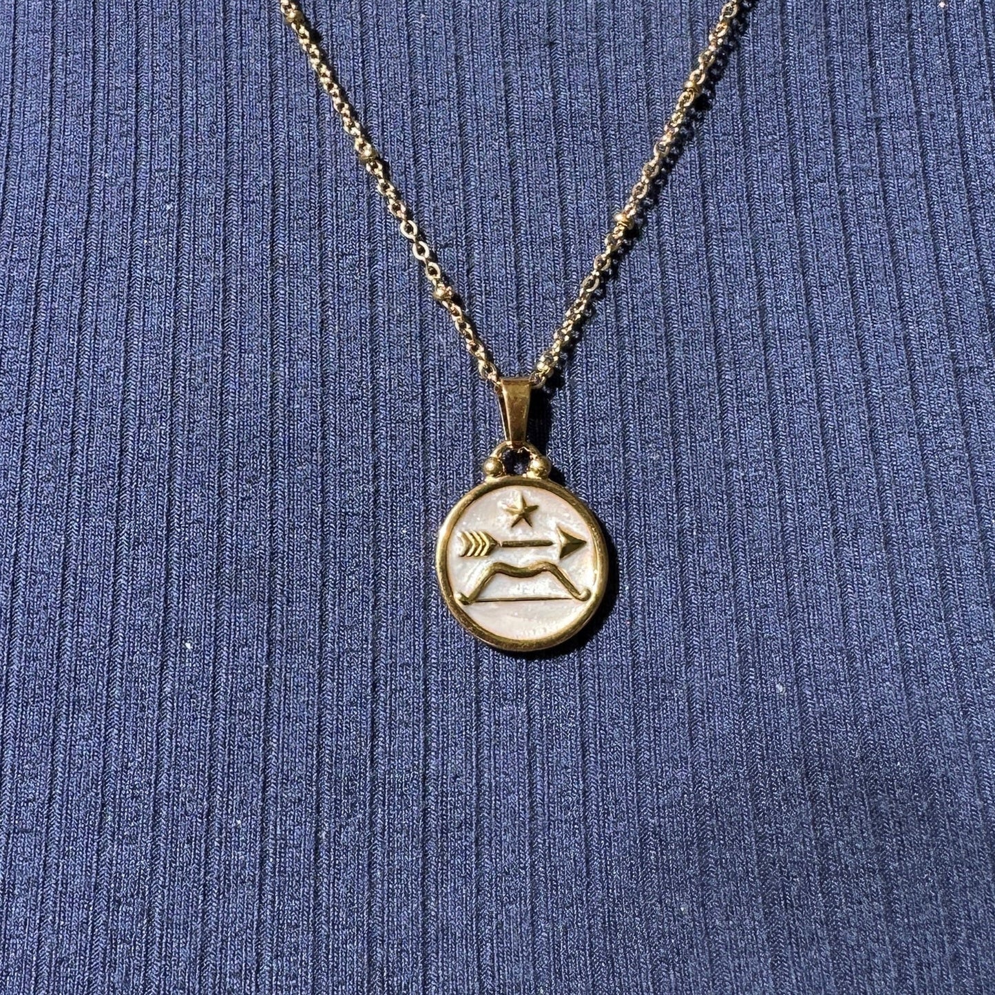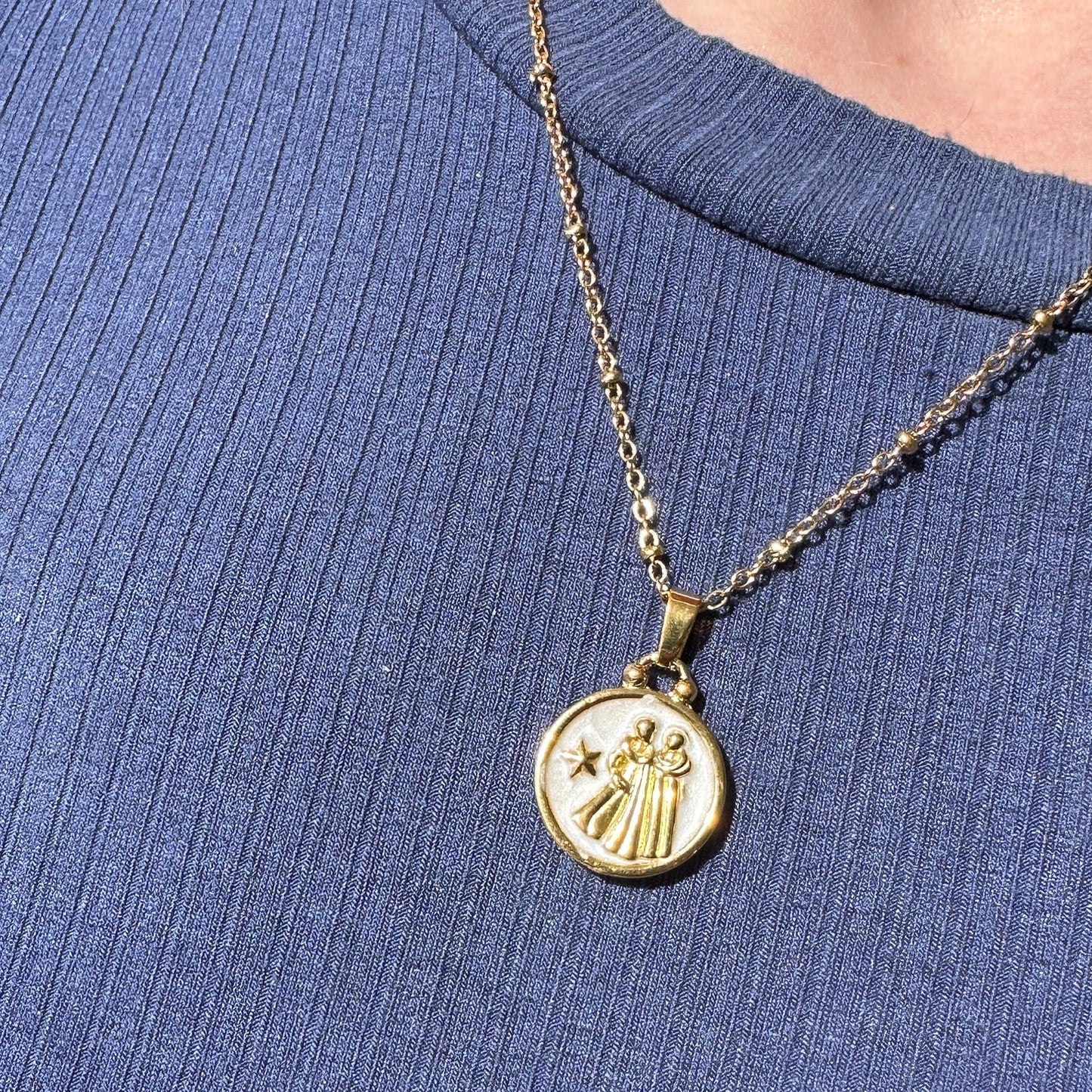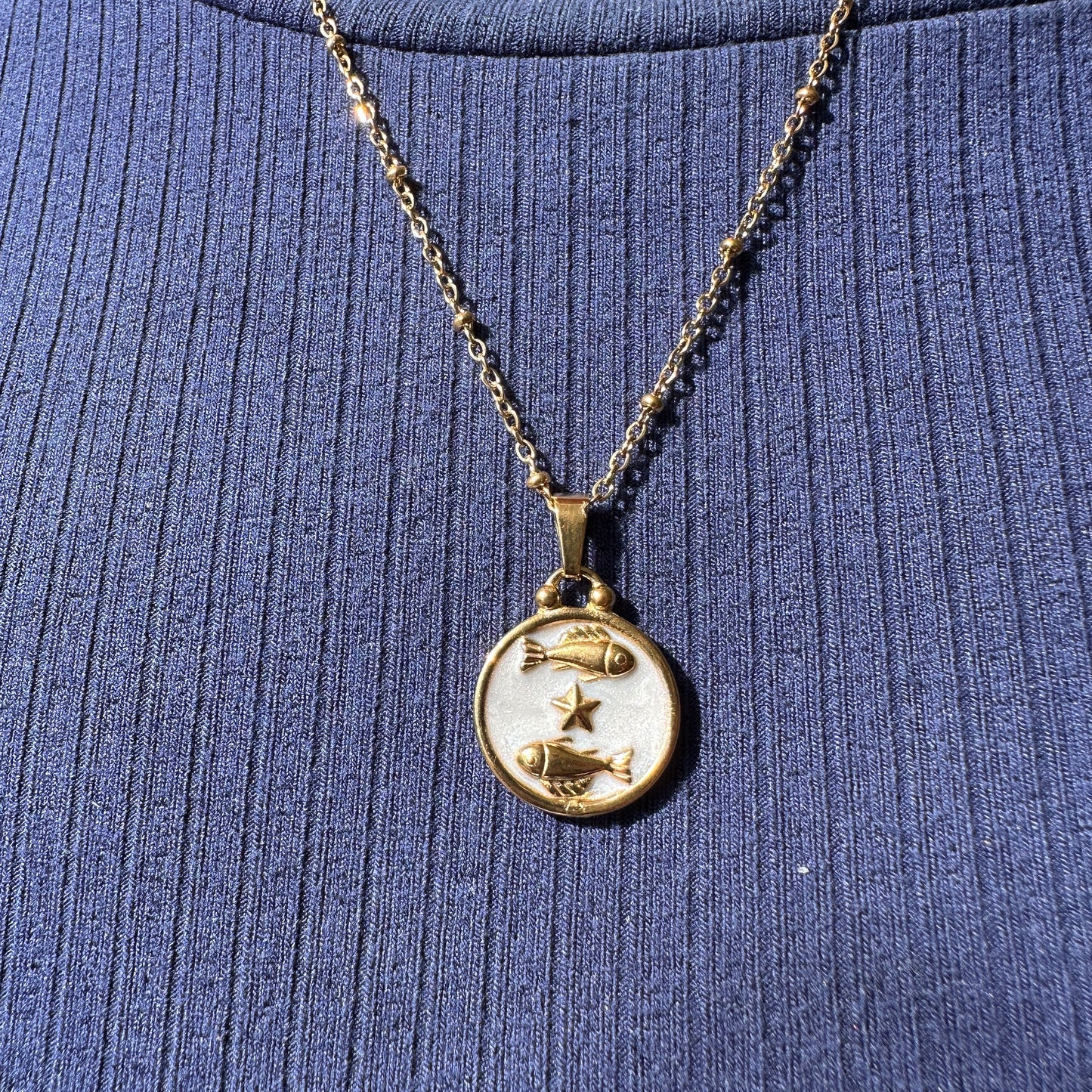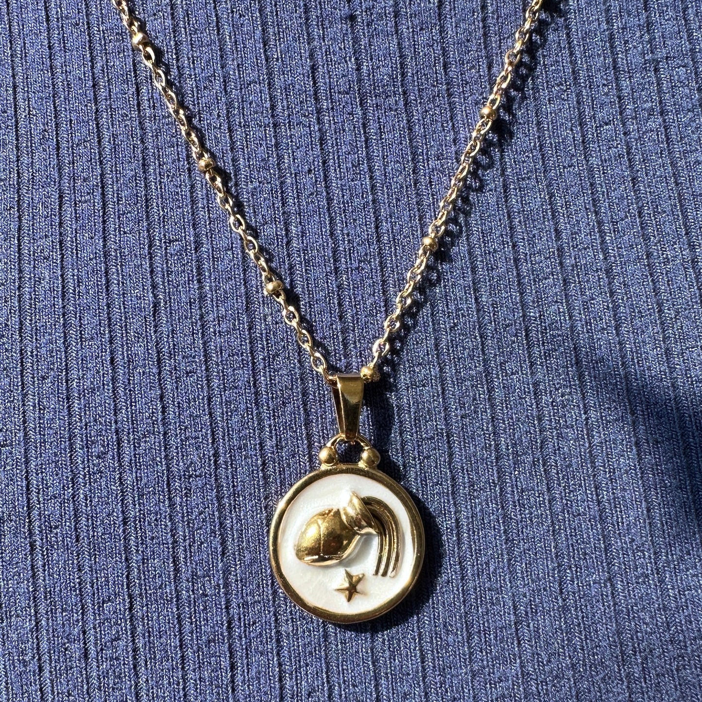 This double-sided necklace features an enamel inlay zodiac-inspired charm on one side, with a coordinating constellation on the back. Suspended from a demi-fine chain accented with delicate gold beads, this piece blends celestial elegance with everyday wearability. A timeless tribute to the stars, perfect for layering or wearing as a personal talisman.